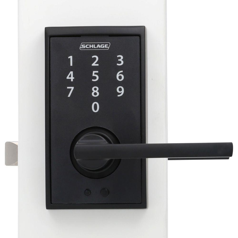 Eliminate the hassle of house keys with the Schlage Latitude Matte Black Touch Electronic Door Lever with Century Trim. There's no key to lose, no re-keying or cutting new keys - no keys at all, thanks to our cylinder-free design. The LED backlight keypad is able to hold up to 19 different user codes for your convenience, and is fingerprint resistant. Also, this electronic door lever runs on a single 9-volt battery, which is included. All in a slim profile and stylish trim that pairs perfectly with interior hardware. The Latitude lever offers a crisp perspective on minimalist design with its clean lines and rectangular features, while the Century trim is chic with a delicate, slightly curved shape. The striking appearance of the Matte Black finish creates an elegant look that's sure to be noticed in any style setting. Plus, it's been designed and tested with strength and durability in mind.