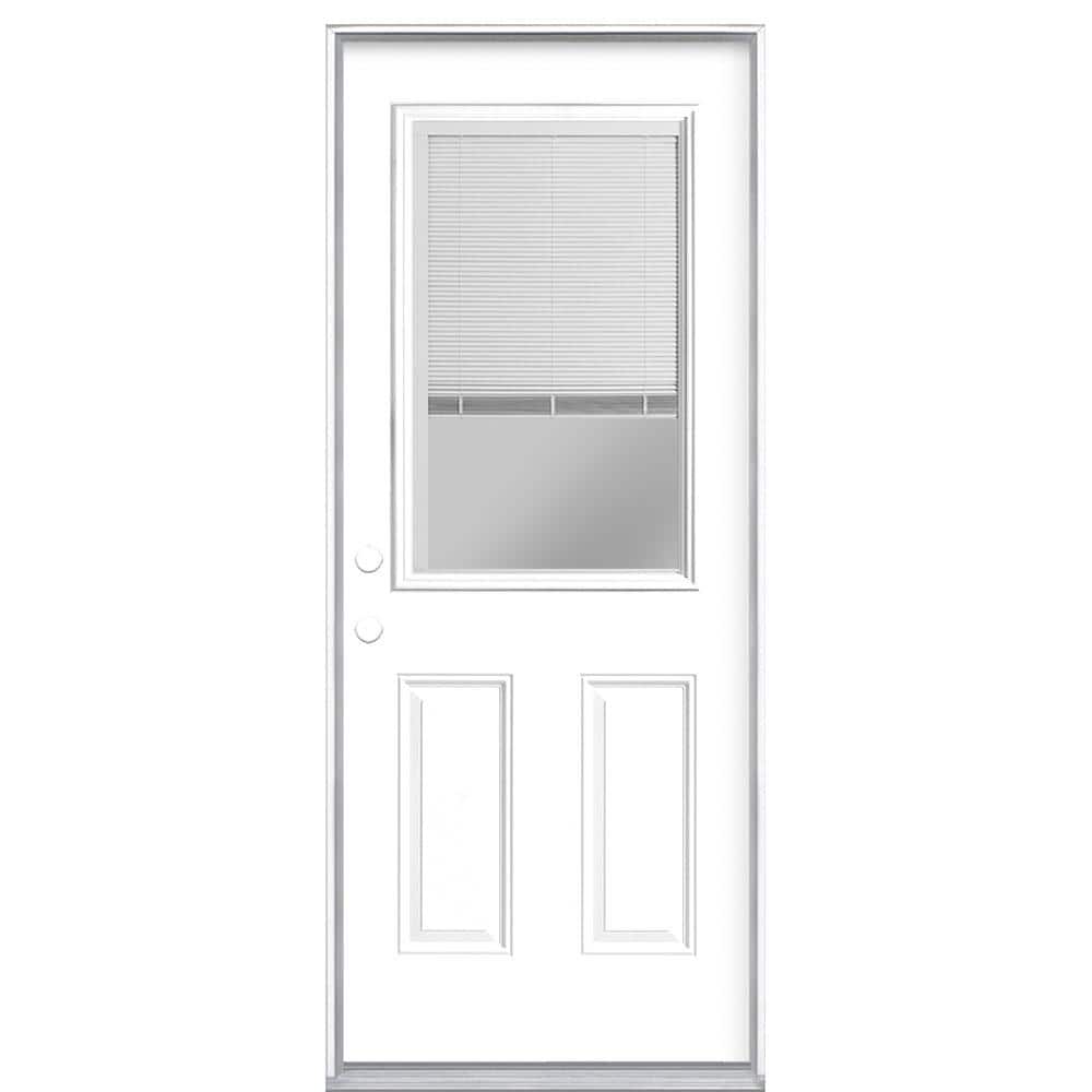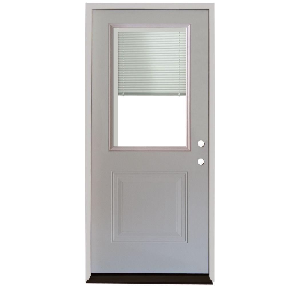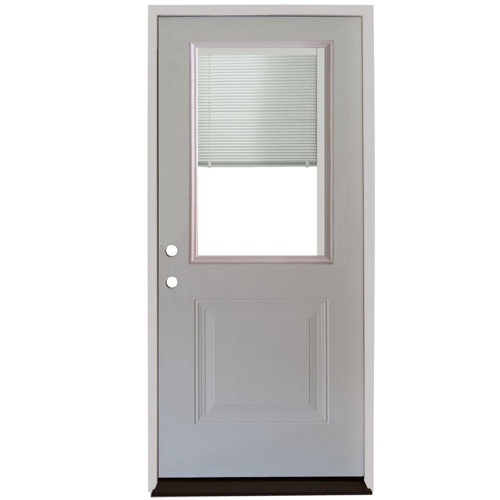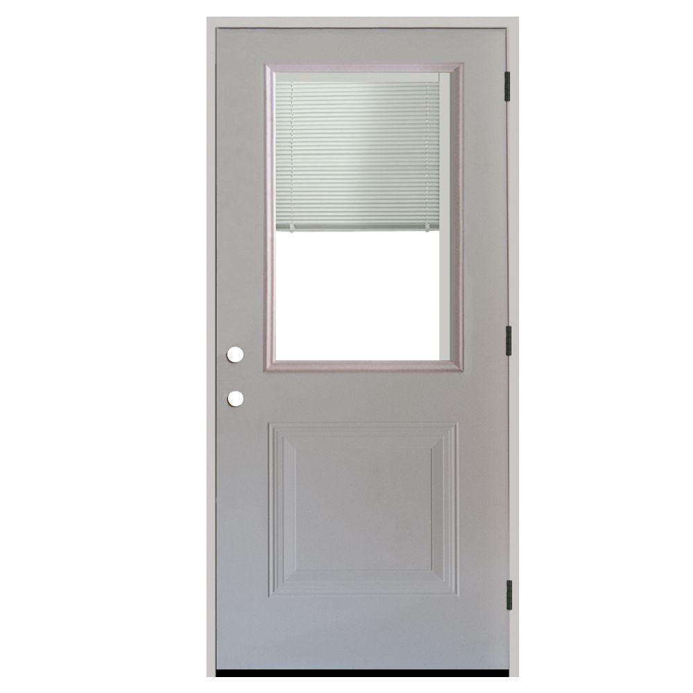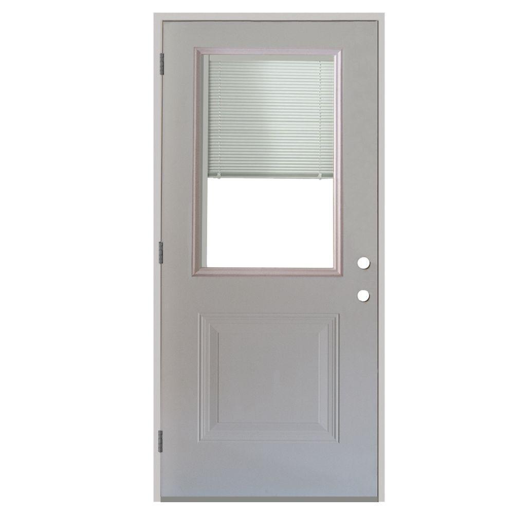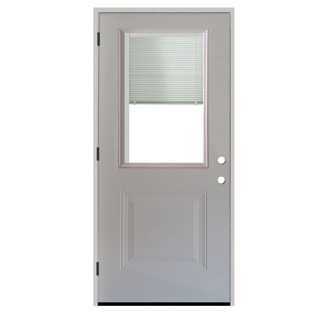 Primed white steel entry door prehung for easy installation, featuring a 1/2 lite glass insert with internal mini blinds for adjustable privacy and light control. Designed for durability and ready to paint, it brings security and style to your home’s exterior.