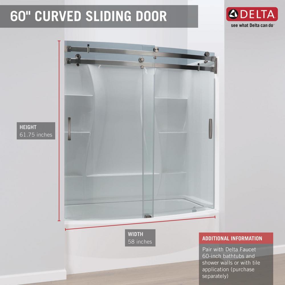 The Delta Curve 60 in. x 62 in. Frameless Sliding Tub Door in Stainless features a sturdy, stainless steel guide rail system, the first frameless sliding curved door in the retail aisle. With no bottom track, middle support or side wall jambs, this door is easy to clean and the Flex Strip low profile, flexible water barrier keeps water in the tub. The antimicrobial coating on the Flex Strip water barrier helps to reduce stain and odor causing microbial growth on the surface of the water barrier so it stays cleaner longer. The sleek industrial modern design of the curved door coordinates with a variety of styles.