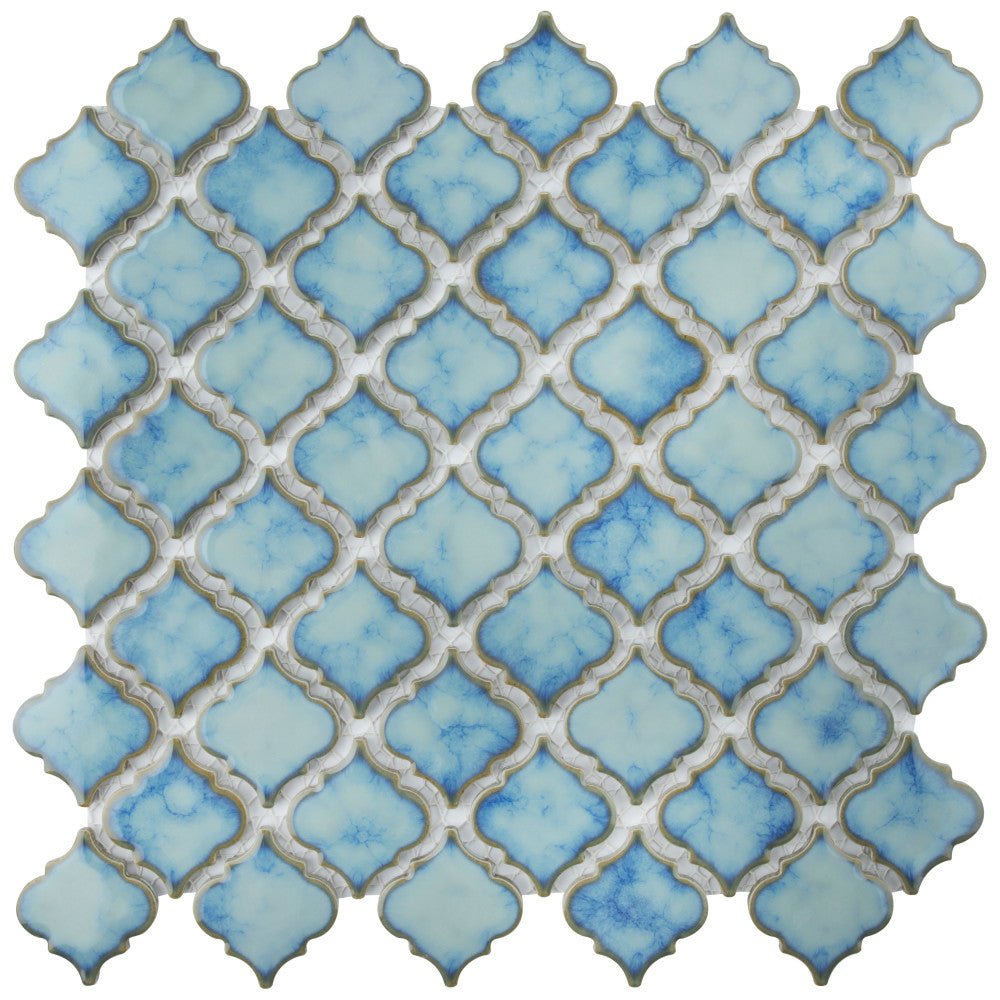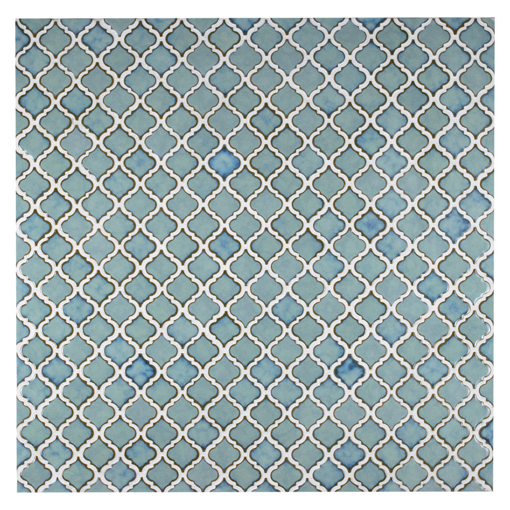 A glossy porcelain mosaic in a classic arabesque pattern, ideal for floors and walls. Impervious and frost-resistant, it suits indoor/outdoor residential or commercial spaces including kitchens, baths, showers, pools, and fireplaces.