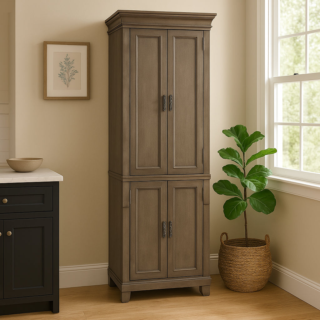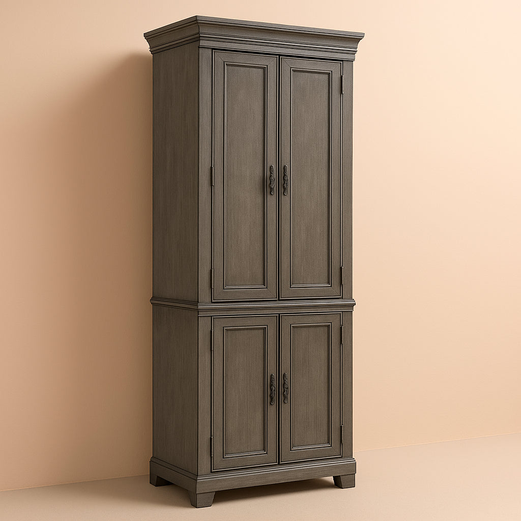 The Naples Linen Cabinet combines rustic charm with practical storage solutions. Featuring a distressed grey finish, adjustable shelves, and antique hardware, this cabinet is both stylish and functional.