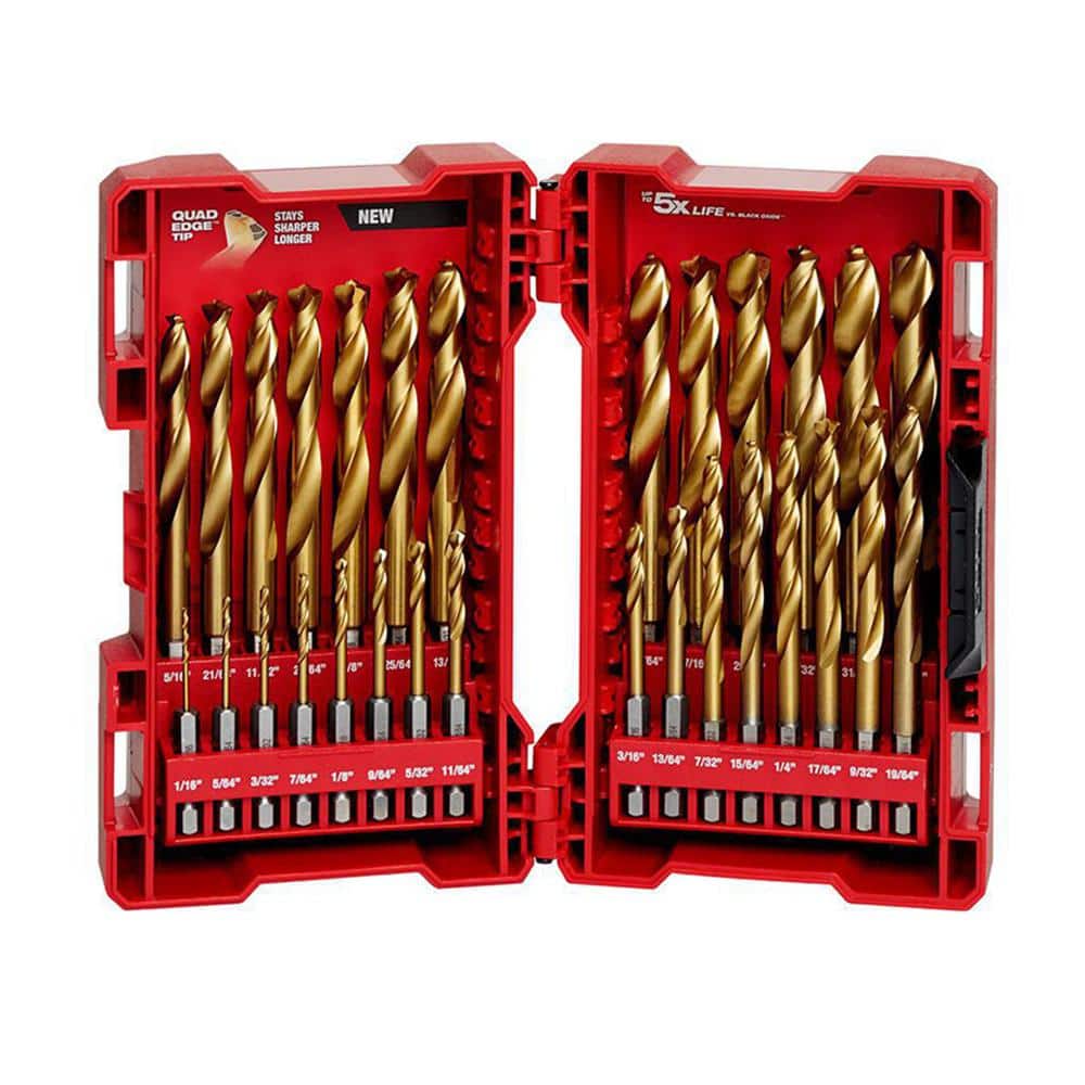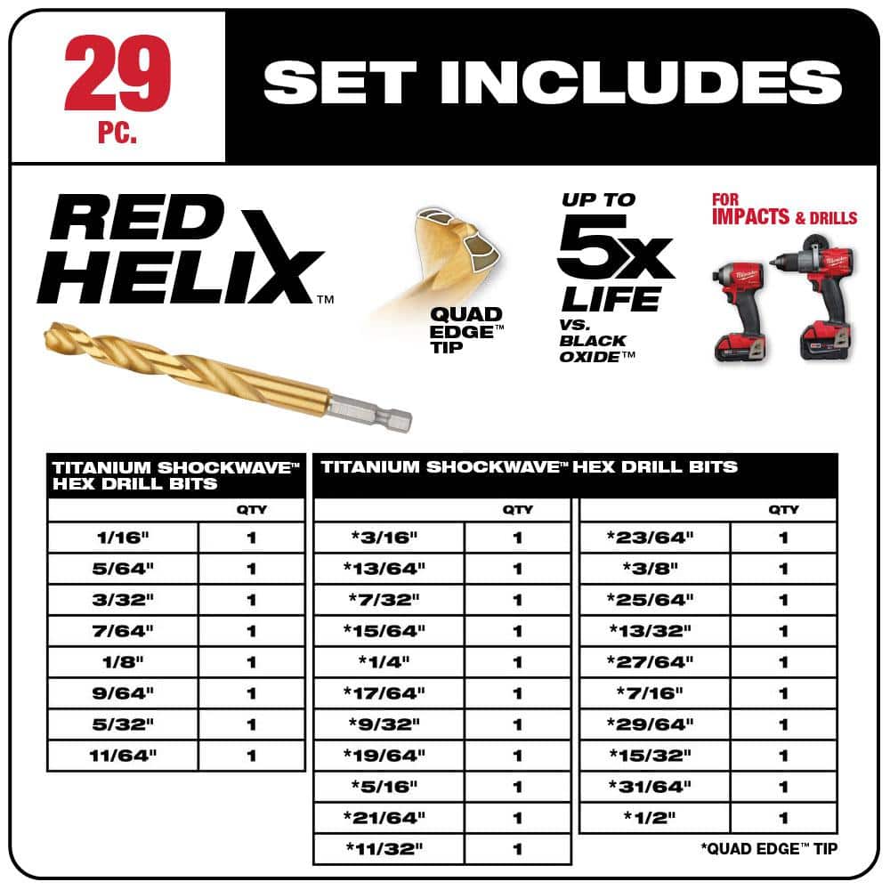 Milwaukee’s 29‑piece SHOCKWAVE RED HELIX titanium set is built for long life in metal, wood, and plastics. A QUAD EDGE tip and variable 35°–15° helix speed chip evacuation to reduce heat, while an enhanced tapered web adds strength to resist breakage. 1/4 in. hex shanks work in drills and impact drivers.