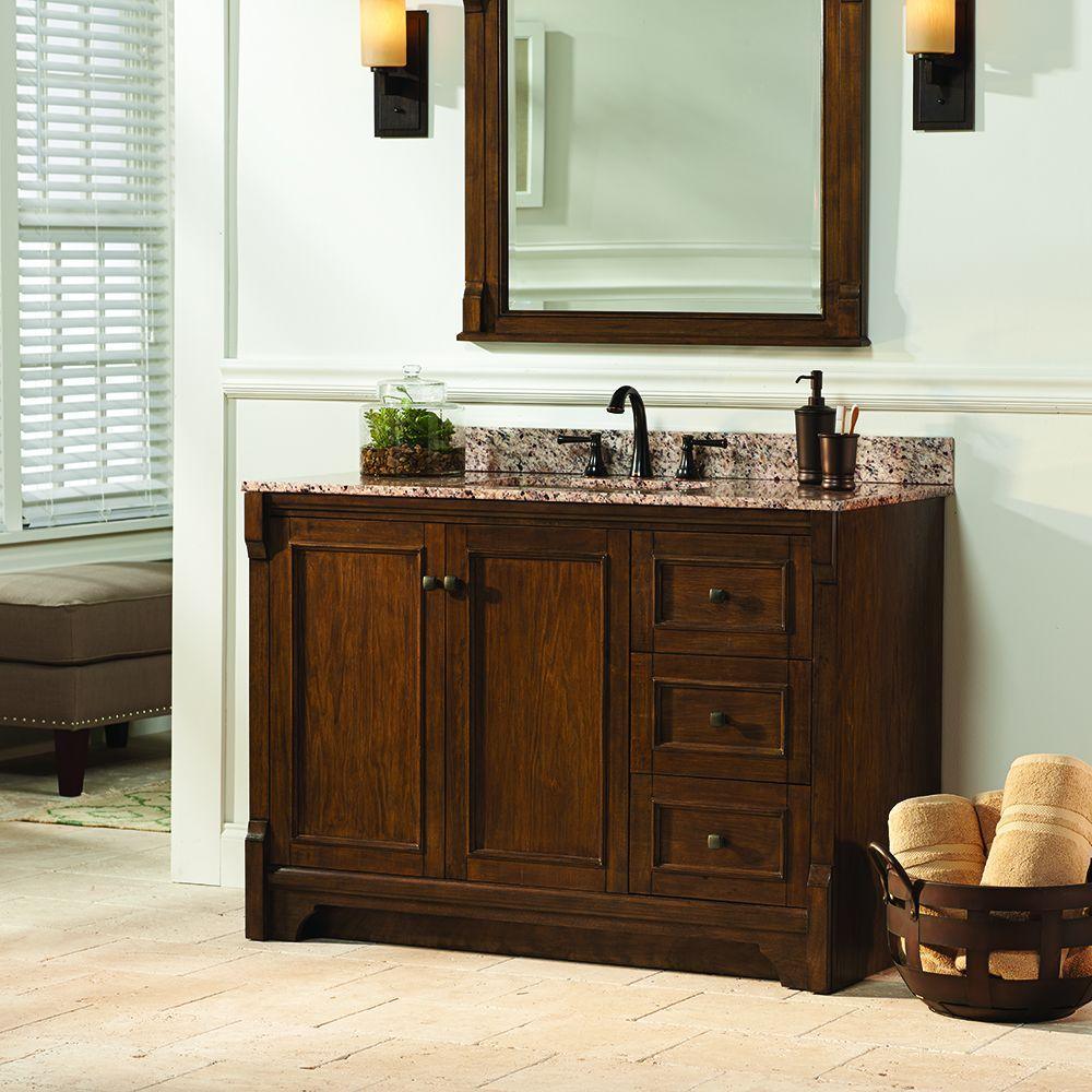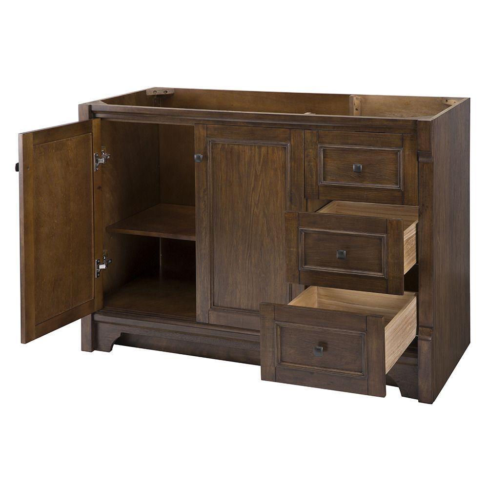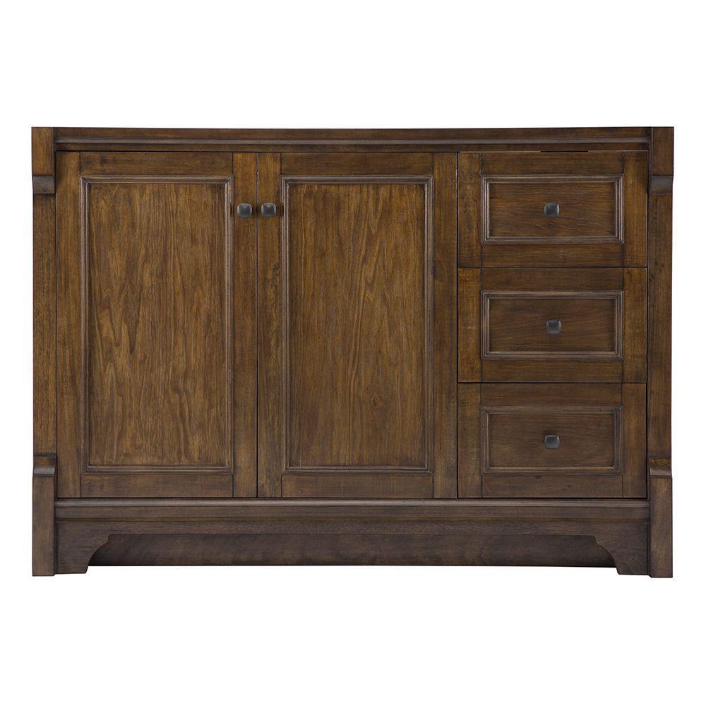 Boasting a traditional design with modern influences, the Creedmoor 48 in. vanity will be the perfect addition to any bathroom. This timeless piece helps make the most of your valuable space in a stylish way with a large interior cabinet behind two framed panel doors, as well as two slow closing drawers. Finished in a gorgeous walnut with a curved toe kick and squared oil rubbed black knobs, this Creedmoor Collection vanity will absolutely impress all that see it.