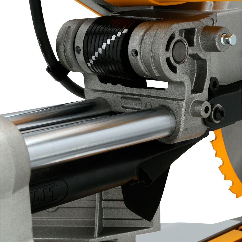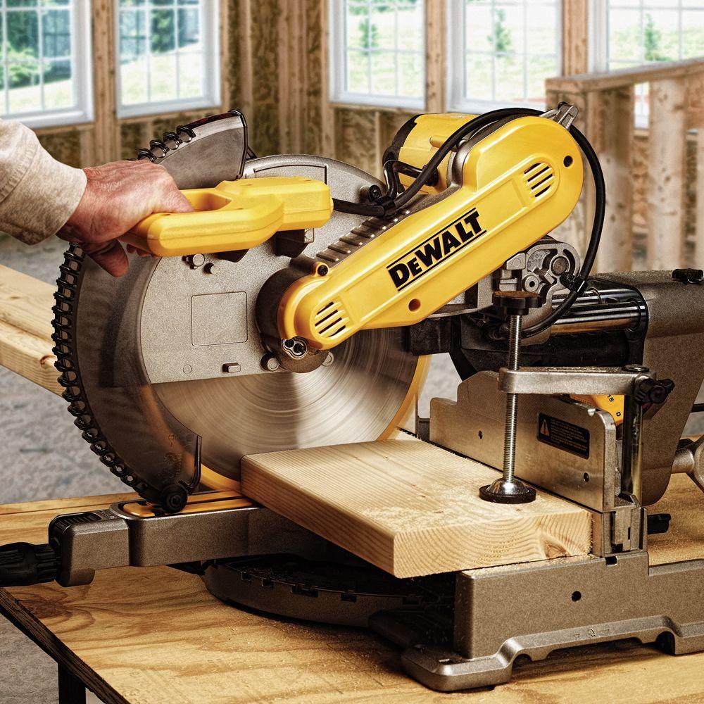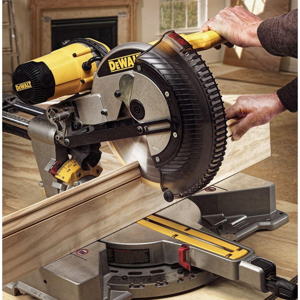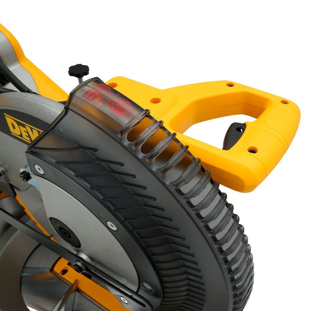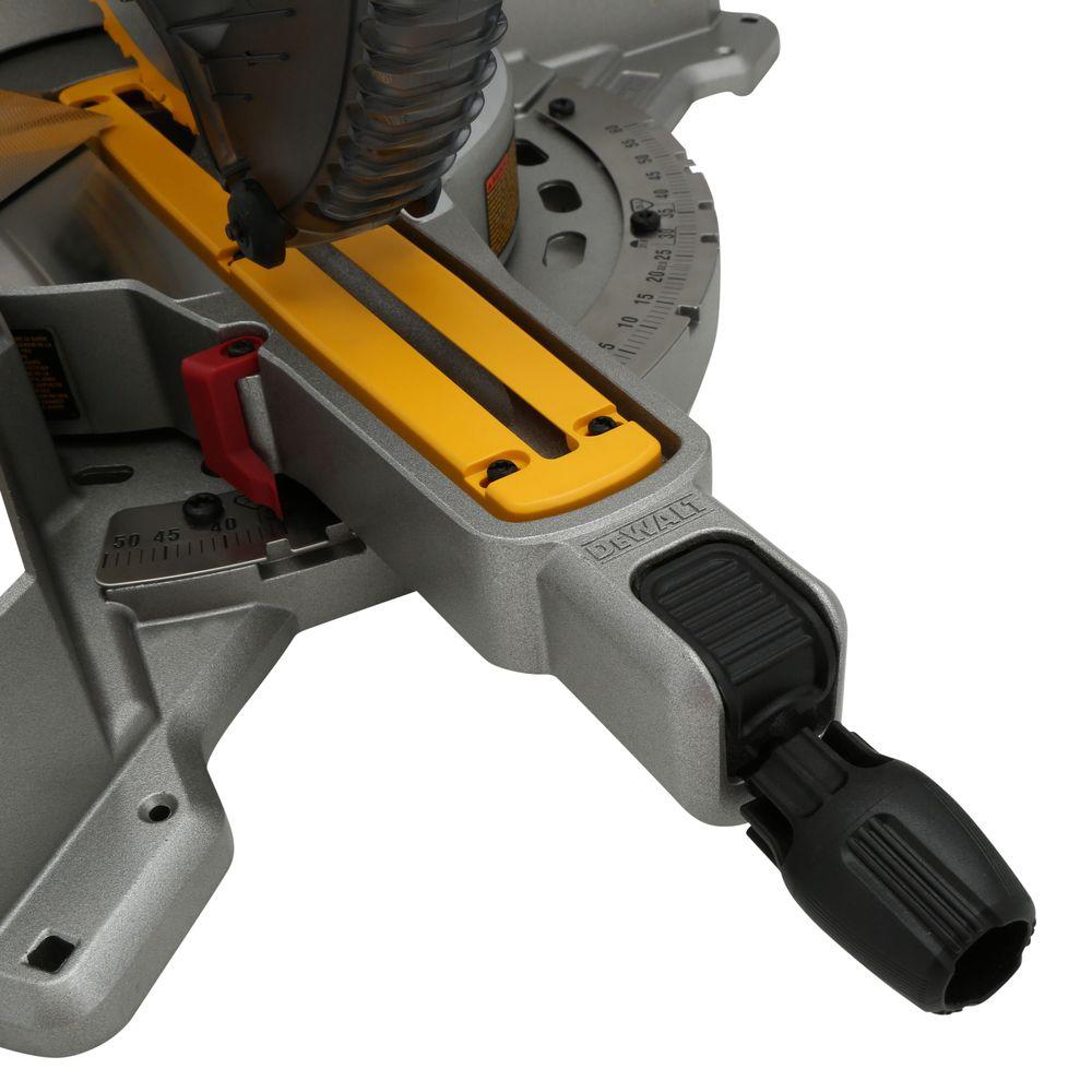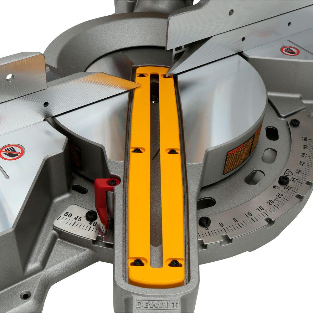 The DEWALT DWS709 miter saw is designed with a powerful 15 Amp, 3800 RPM motor that delivers exceptional power and durability. A tall sliding fence supports crown molding up to 5-1/2 in. nested and base molding up to 4-1/2 in. vertically against the fence while easily sliding out of the way for bevel cuts. This saw features an exclusive back fence design that cuts up to 2 in. x 14 in. dimensional lumbers at 90 degrees and 2 in. x 10 in. at 45 degrees.