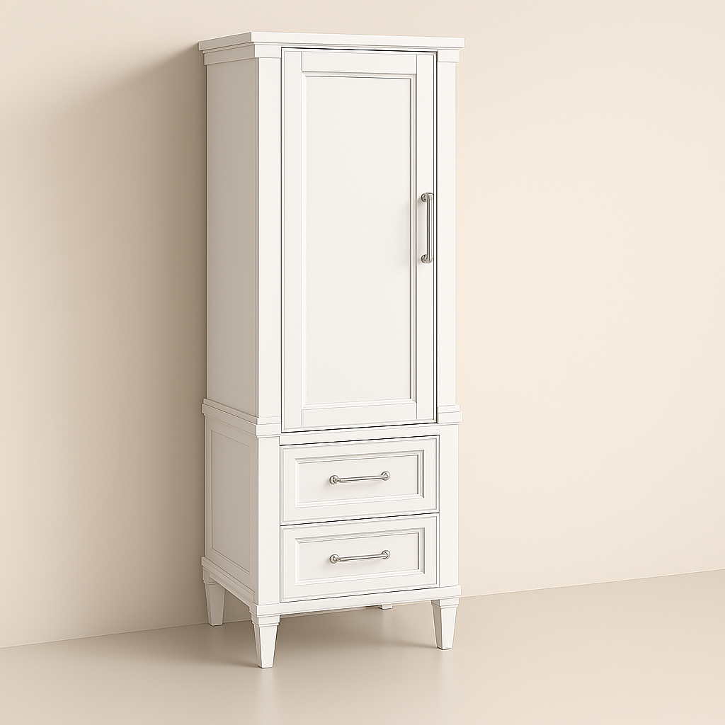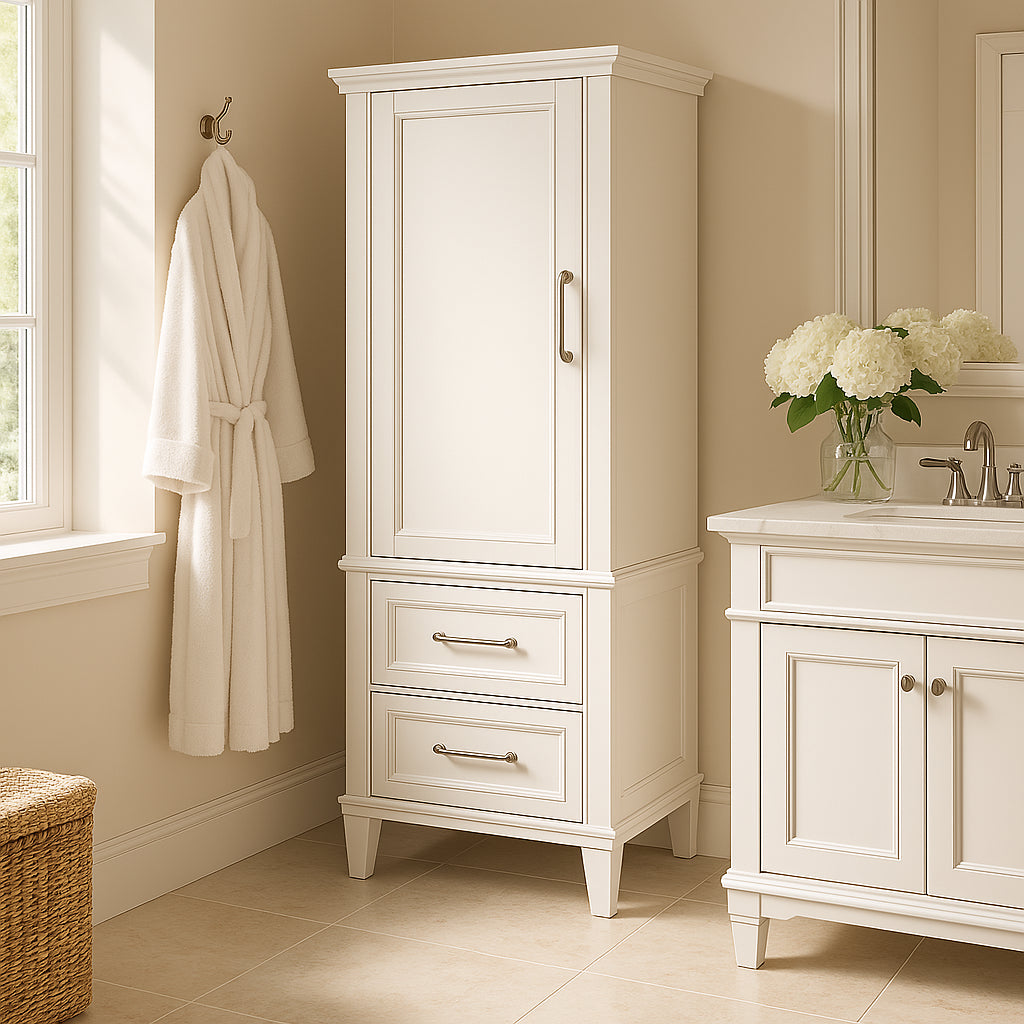 The Aberdeen Linen Storage Cabinet combines modern design with practical storage solutions. Featuring a soft-close door, adjustable shelf, and concealed drawers, it maximizes vertical space while adding a touch of elegance to your bathroom.
