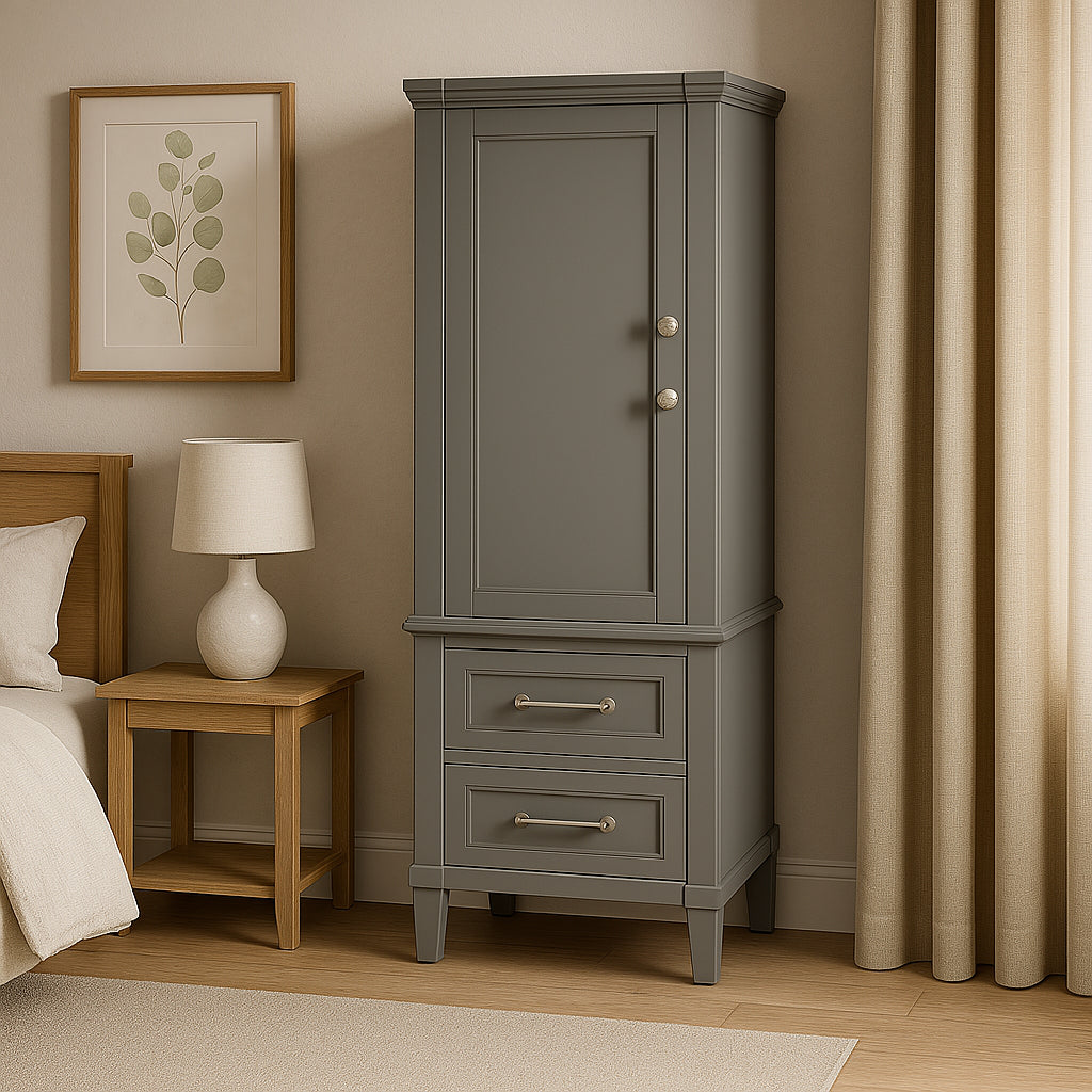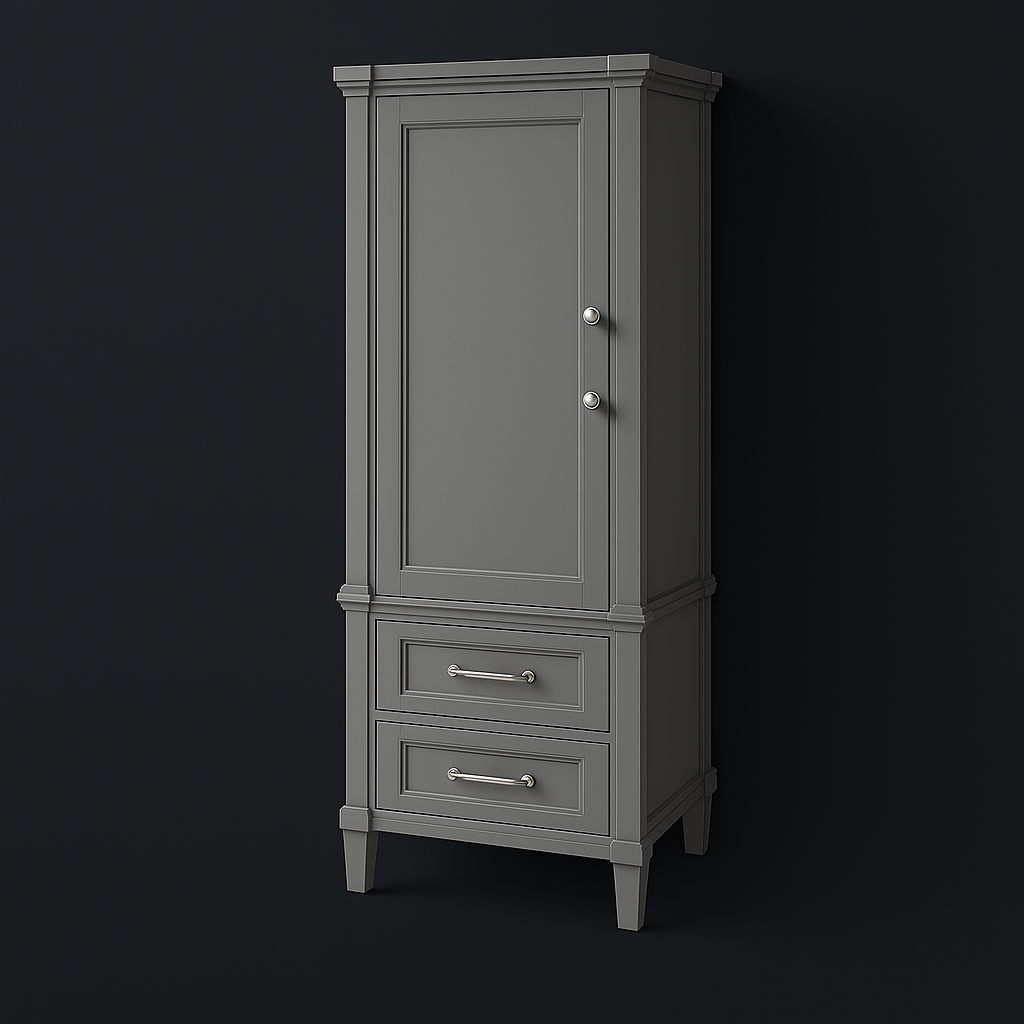 The Aberdeen Linen Cabinet combines modern design with practical storage solutions. Featuring a soft-close door, adjustable shelf, and two drawers, it offers ample space for your bathroom essentials. Its dove grey finish and chrome hardware add a touch of elegance to any bathroom.
