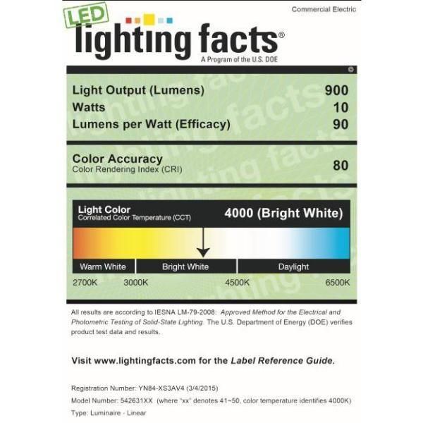 Need to concentrate on a task where clear crisp lighting is essential; Commercial Electric's 2 ft. LED Strip light is for you. This fixture is designed to easily convert outdated fluorescent bulbs to crystal clear energy-efficient LEDs. It emits 900 Lumens of brightness using only 10-Watts with 4000K Bright White color temperature. It replaces outdated 17-Watt fluorescent light. It is Energy Star rated which offers year round savings to your utility bill. This strip light includes a 14 in. linking cord, end to end connector and a 5 ft. plug-in power cord. It makes for easy installation individually or continuously. Suggested applications are under cabinets, work bench, tool bench, storage room, pantry, desk hutch or kitchen desk.