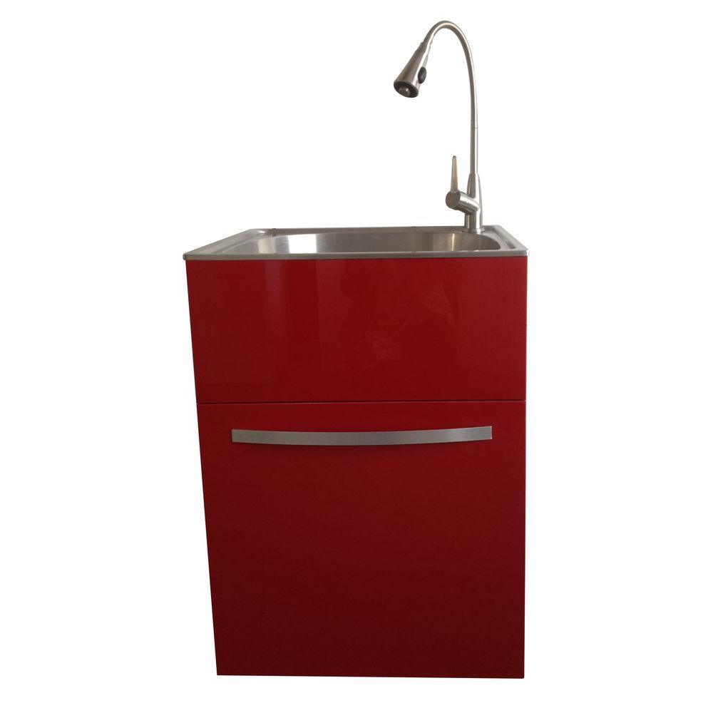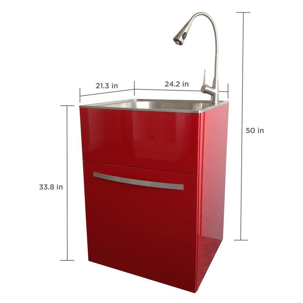 This Presenza utility sink and storage cabinet is the perfect way to give your laundry room a sleek, modern look. The large drawer is ideal for storage of cleaning products. Water saving brushed nickel flex-neck faucet comes equipped with a dual spray head and a garden hose adapter for maximum convenience and versatility