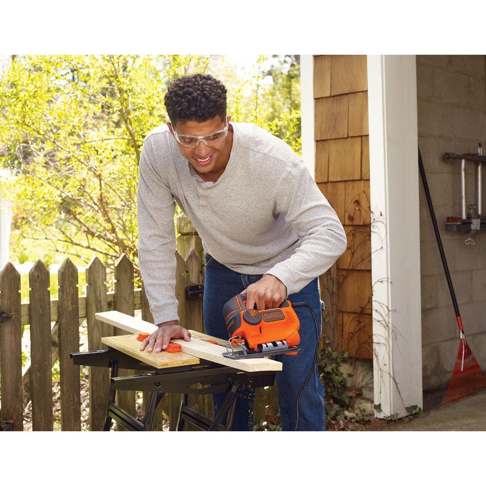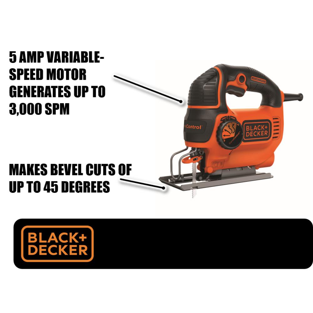 The BLACK+DECKER BDEJS600C 5 Amp Jig Saw features Curve Control technology, allowing you to adjust the saw's Orbit in 1 of 4 customized settings to help complete your specific project. The 5 Amp variable-speed motor generates up to 3,000 SPM of cutting power. This saw can make bevel cuts of up to 45 degree and features an adjustable shoe for a stable cutting platform. It also has a new and improved Wire Guard which provides clear line of sight for precise cuts.