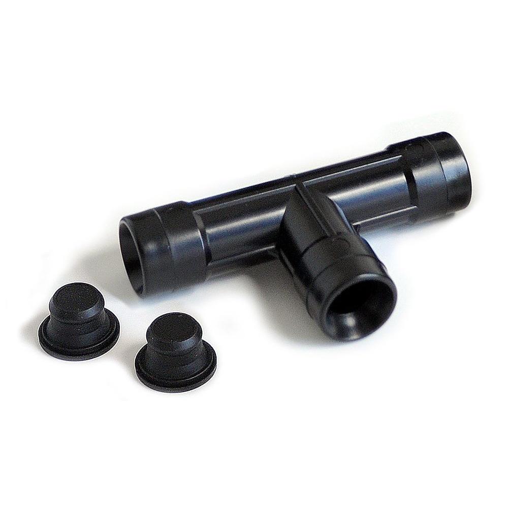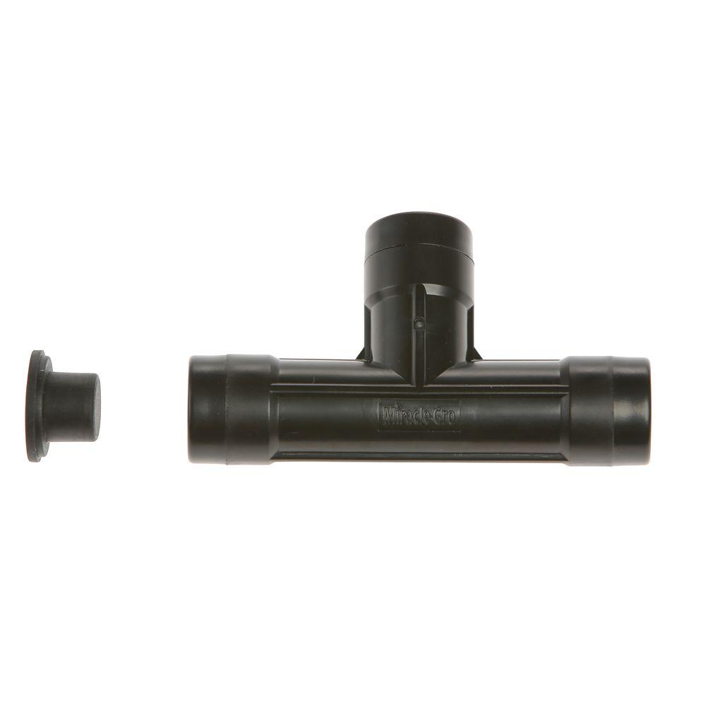 This Element T Push-On Coupling with 2 plugs can be used with any Miracle-Gro Soaker System or Element Soaker System as a replacement part or add-on. The tough high impact plastic on these T couplings is strong enough to endure daily use, so you can maintain a lush lawn and garden with ease year after year. Part of the EZ-Connect System which allows you to completely customize your soaker layout by using a combination of Male, Female, T and Feeder EZ-Connect couplings. T couplings connect allow you to split the soaker hose water flow in two different directions.
