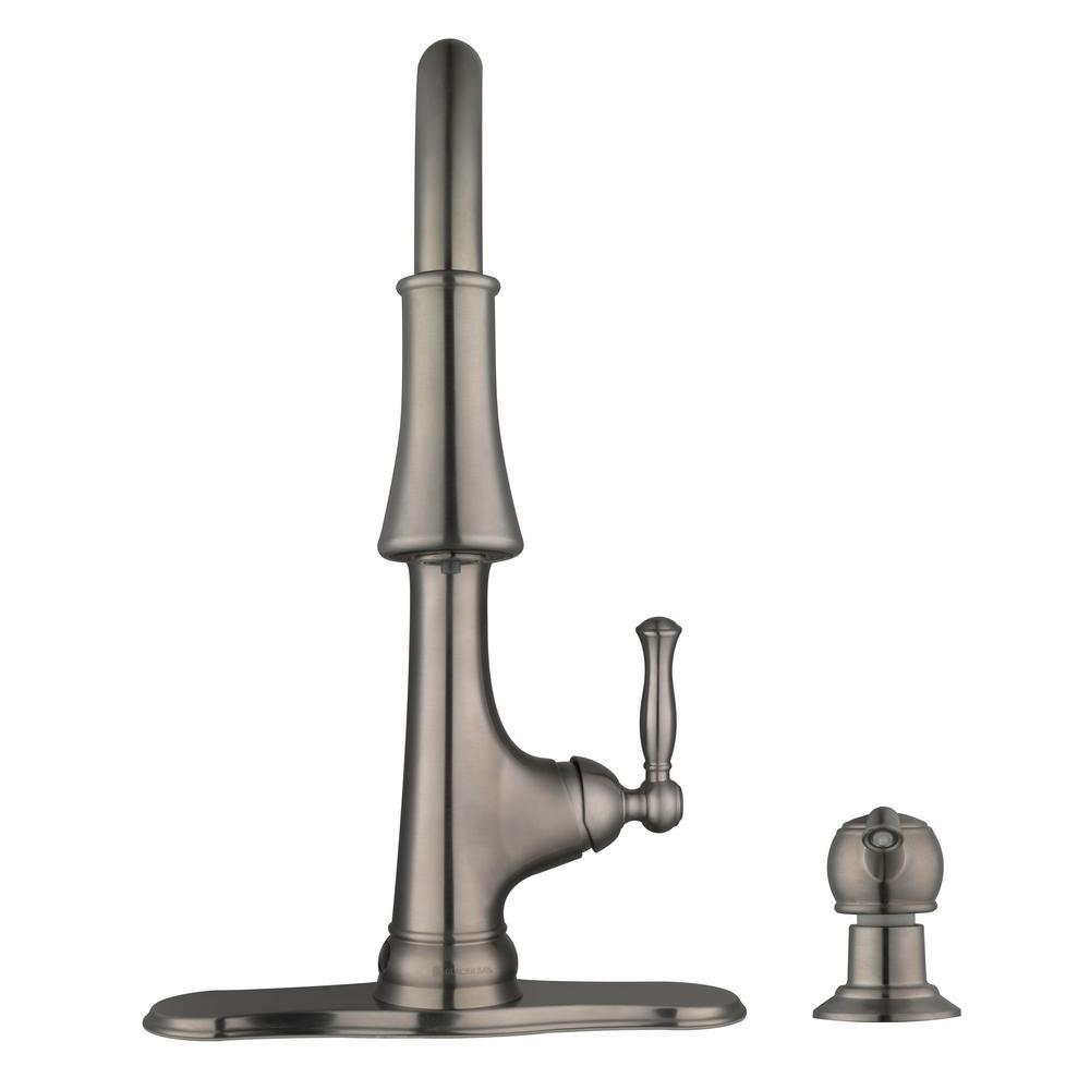 The Glacier Bay Touchless LED Single-Handle Pull-Down Sprayer Kitchen Faucet with Soap Dispenser in Stainless Steel is a faucet that blends innovation with style. The intuitive sensor allows hands free use of the faucet, which is ideal to reduce the spread of bacteria in the kitchen. Simply wave your hand in front of the sensor to start and stop the flow of water. The pull-down spray head features a white LED light that runs off energy generated from the flow of water. The LED provides both an aesthetically pleasing design coupled with a sensible solution for your kitchen needs. Use the LED spray head to ensure your pots and pans are spotless. Easily access your soap with the included matching soap dispenser. This faucet also features a ceramic disc cartridge and limited lifetime warranty.