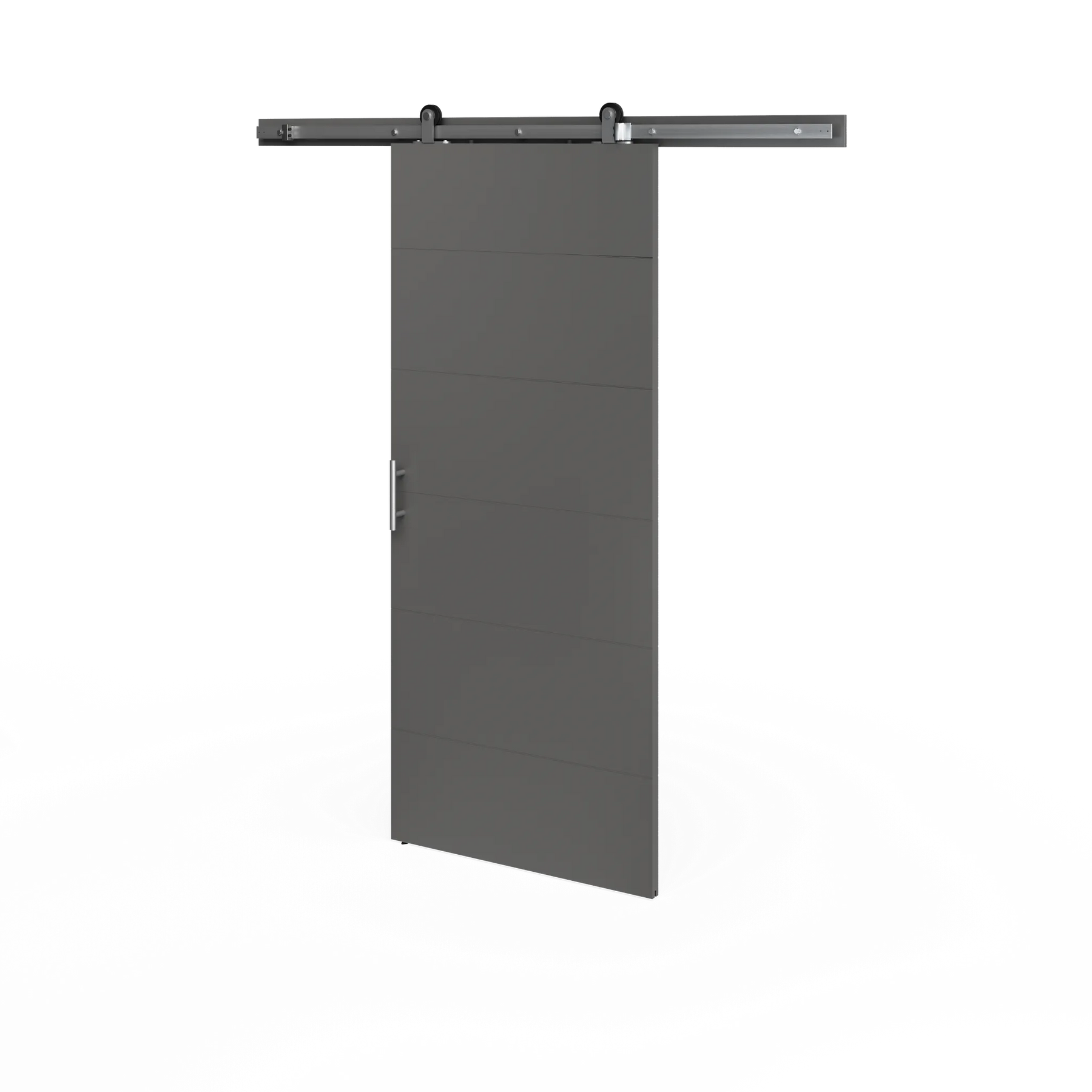 A modern Melrose interior barn door kit from Masonite, primed and ready to paint. The 36 in. x 84 in. slab glides on a sleek track and includes the complete hardware kit for a quick style upgrade in tight spaces.