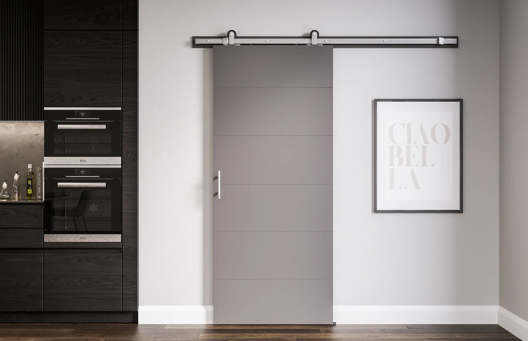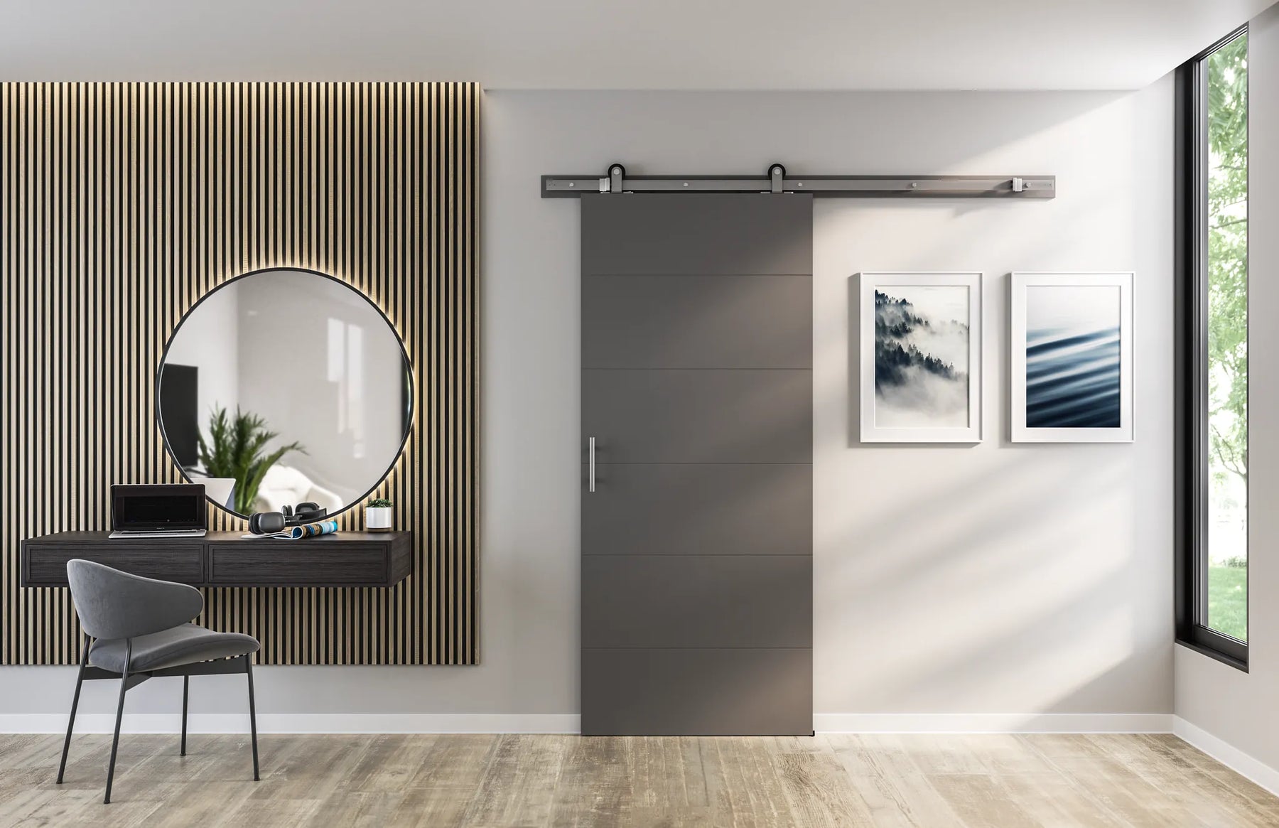 The Melrose barn door introduces a disciplined, horizontal rhythm that instantly elevates a room. Its primed surface becomes a canvas—choose a moody charcoal or a soft white to tailor the tone. Style it with warm brass accents or layered neutrals to create a refined, gallery-like moment. This is modern luxury distilled: quiet, functional, and beautifully composed.