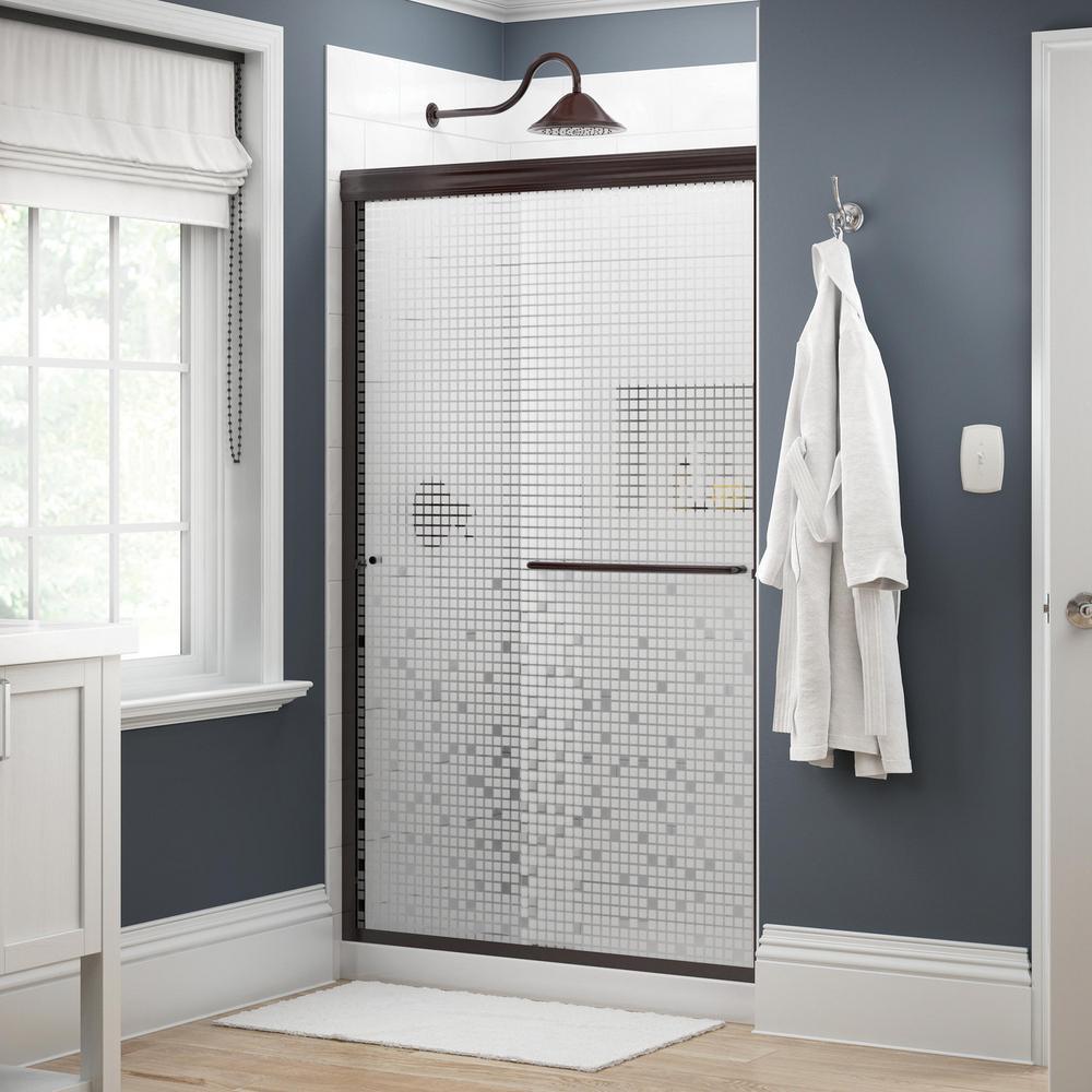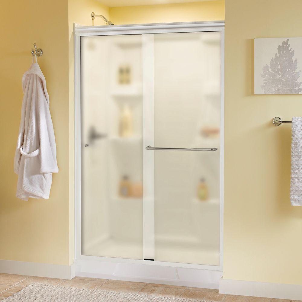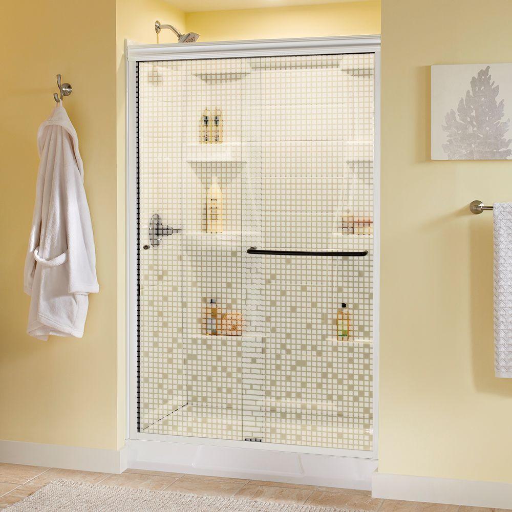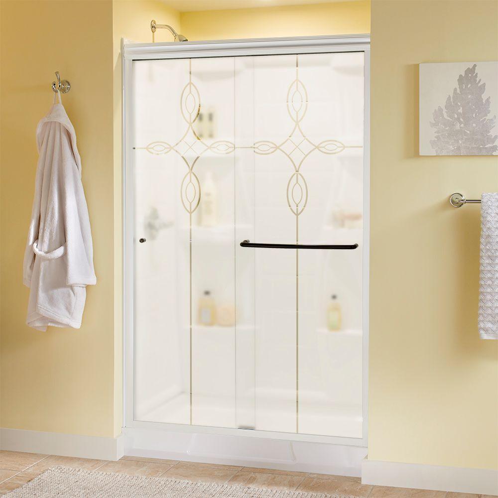Delta sliding glass shower panels feature Delta Spot Guard glass treatment for easy cleaning, to resist water spots and hardwater stains, and help reduce soap scum and limescale buildup when properly maintained