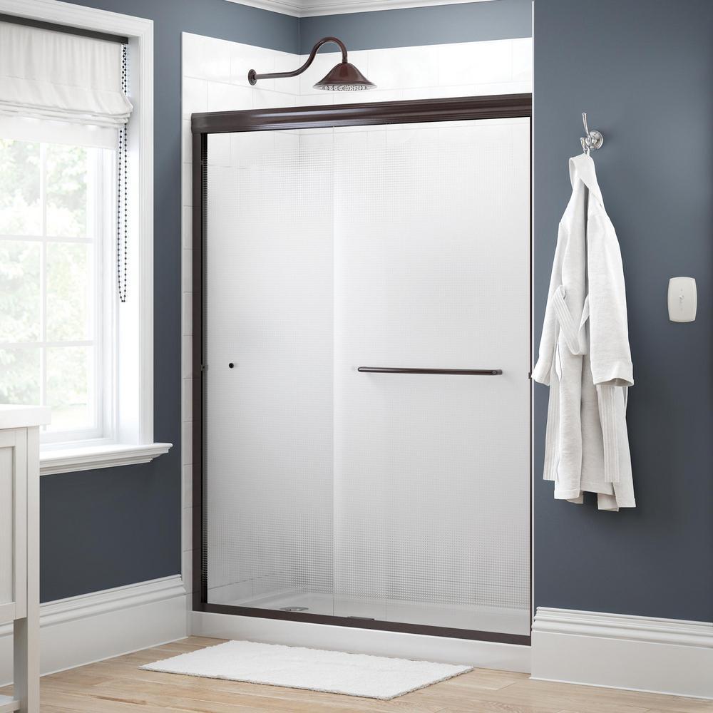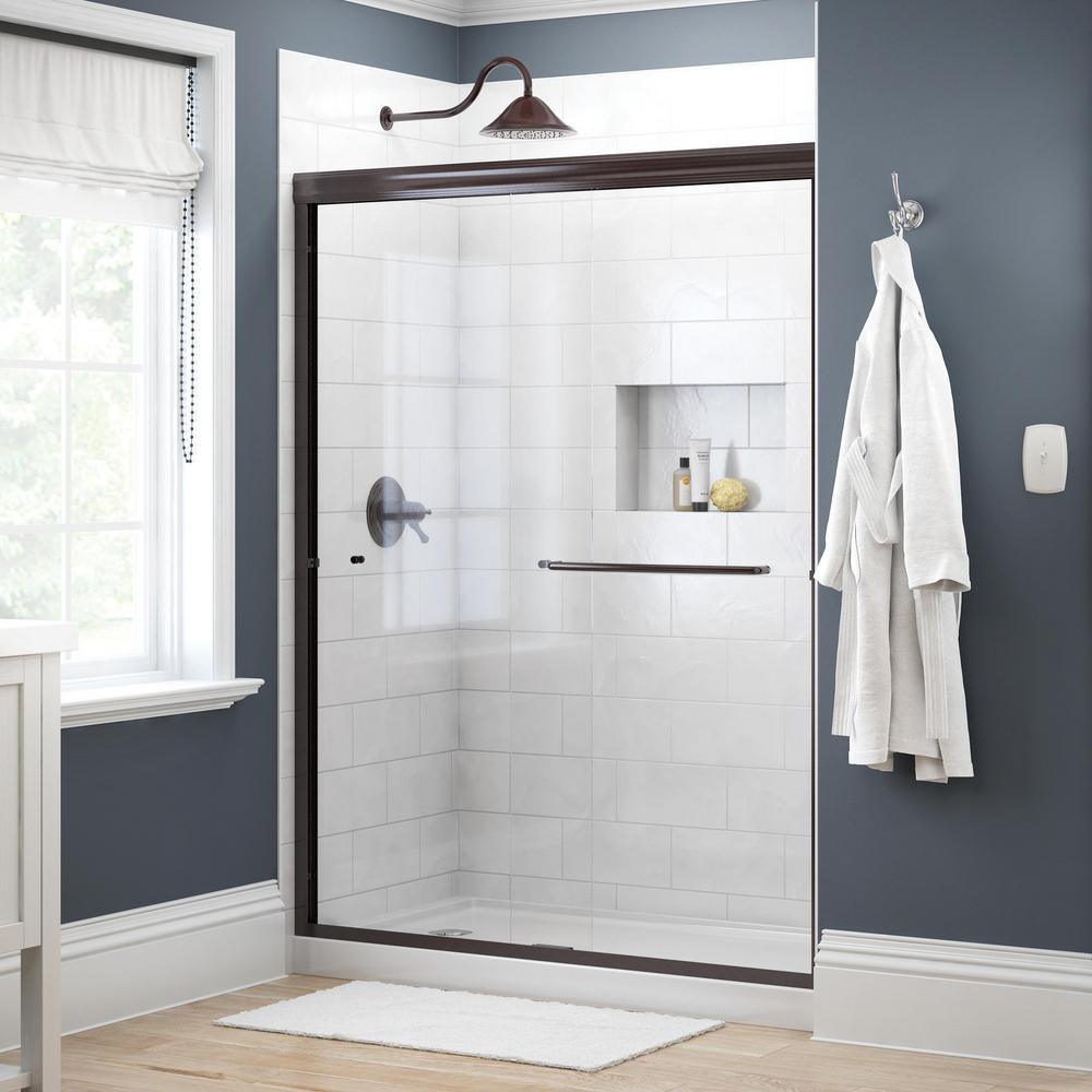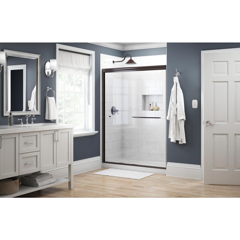 Whether you’re looking for a moderate DIY project or working on a bathroom remodel, upgrading your bathroom with a new sliding shower door is easy with the Delta 1-2-3 custom sliding shower door program. Delta’s custom glass shower door program offers 1000s of design combinations by choosing your glass shower panels, shower door track, and shower door handles to build a unique, personalized glass shower door. Simple and classic, the Traditional shower door track in bronze features a reversible top track with two unique profiles that offer uncompromised quality and value with a design that’s familiar and balanced. Show off your beautiful shower with standard 1/4 in. ANSI certified tempered glass shower panels, featuring Delta Spot Guard with a completely transparent look for a glass shower door that is both simple and elegant. The Simplicity sliding shower door handle with knobs features a convenient towel bar for extra bathroom storage and two interior knobs for extra showering space in a simple design silhouette that beautifully combines form and function.