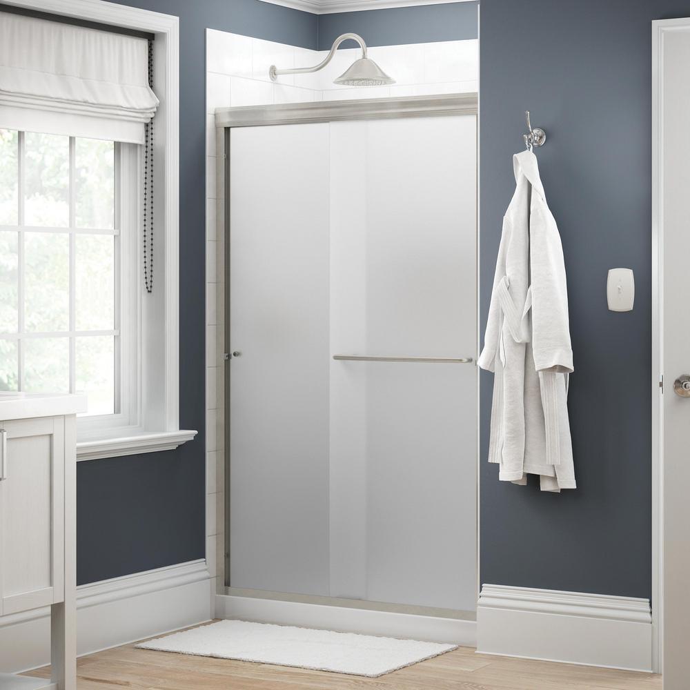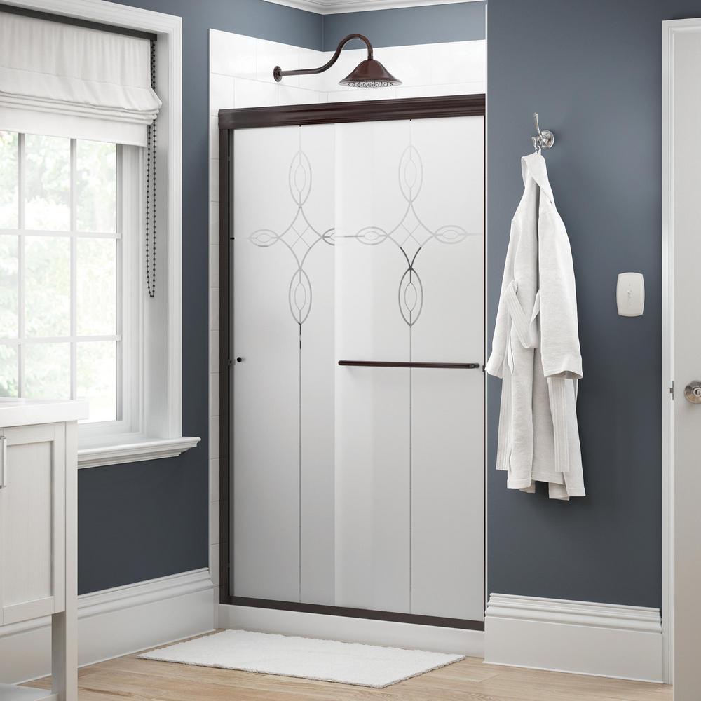 • Traditional sliding shower door designed to accommodate out-of-plumb (uneven, not vertically level) conditions totaling 3/8 in.