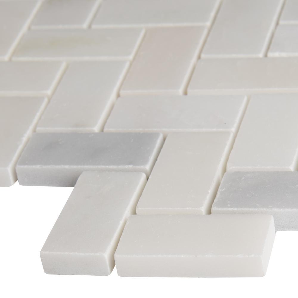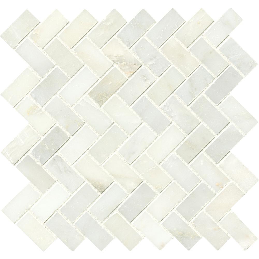 Add a splash of contemporary style to your decor with this 12 in. x 12 in. x 10 mm. polished marble mesh-mounted mosaic floor and wall tile. This Grade 1 tile lends a unique, arabesque pattern to your floors, walls and countertops. The attractive tile-pieces are sized on a mesh sheet for easy installation in your residential or commercial expanse. This flooring option is designed with elegant white shades and durable flair; it features chips of natural marble in a herringbone pattern. Natural stone products inherently vary in color, shade and finish, so it is recommended to blend tiles from different boxes when installing. Seal all-natural stone with a penetrating sealer. Offering supreme style and strength, the impervious, frost-resistant tile absorbs less than 0.5 percent of water. Included per case are 10-pieces. Note: Inspect all tiles before installation. Natural stone products inherently lack uniformity and are subject to variation in color, shade, finish etc. It is recommended to blend tiles from different boxes when installing. Natural stones may be characterized by dry seams and pits that are often filled. The filling can work its way out and it may be necessary to refill these voids as part of a normal maintenance procedure. All natural stone products should be sealed with a penetrating sealer.