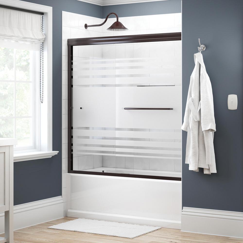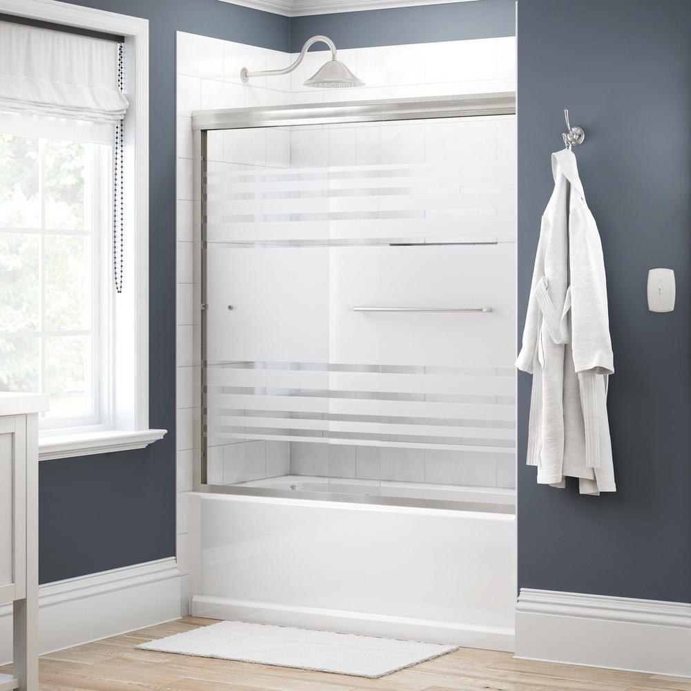 Whether you’re looking for a moderate DIY project or working on a bathroom remodel, upgrading your bathroom with a new sliding shower door is easy with the Delta 1-2-3 custom sliding shower door program. Delta’s custom glass shower door program offers 1000s of design combinations by choosing your glass shower panels, shower door track, and shower door handles to build a unique, personalized glass shower door. Simple and classic, the Traditional bathtub door track in nickel features a reversible top track with two unique profiles that offer uncompromised quality and value with a design that’s familiar and balanced. Make a statement with standard 1/4 in. ANSI certified tempered glass shower panels, featuring a mainly smooth and frosted surface with a traditional design element that’s luxurious and relaxing. The Simplicity sliding shower door handle with knobs features a convenient towel bar for extra bathroom storage and two interior knobs for extra showering space in a simple design silhouette that beautifully combines form and function.