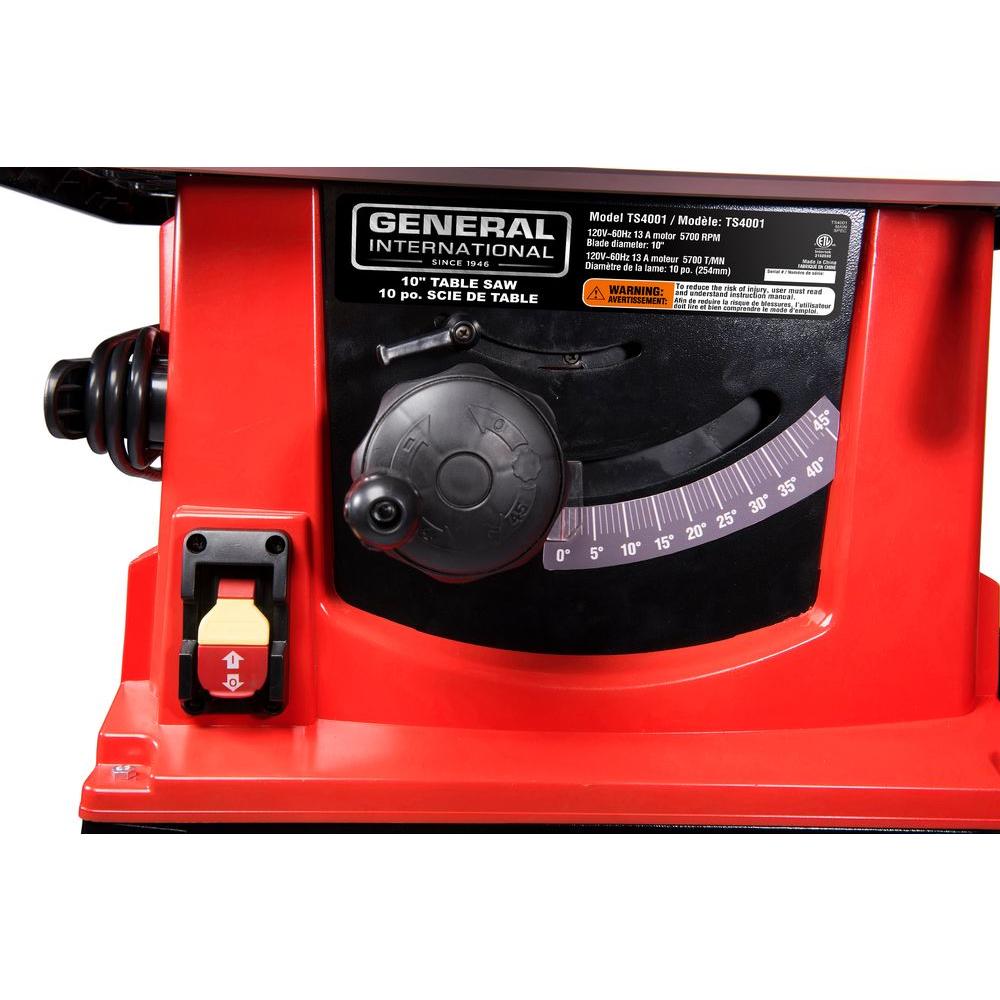 The General International 10 in. Table Saw with Stand features a 13.0 Amp high-torque motor with the power to cut pressure-treated lumber and hardwoods. It offers 2-7/8 in. depth of cut at 90° and 2-5/8 in. at 45°. On board storage provides easy access to the components and push stick when not in use. Includes a 2-year limited warranty.