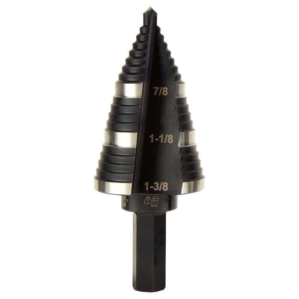 These Double-Fluted Step Drill Bits provide faster cutting and drilling than single flute bits. The easy-to-read step markings and targets save time when drilling holes. Thick 3/8-Inch hex shank provides a firm, positive grip and won't spin out in the drill.