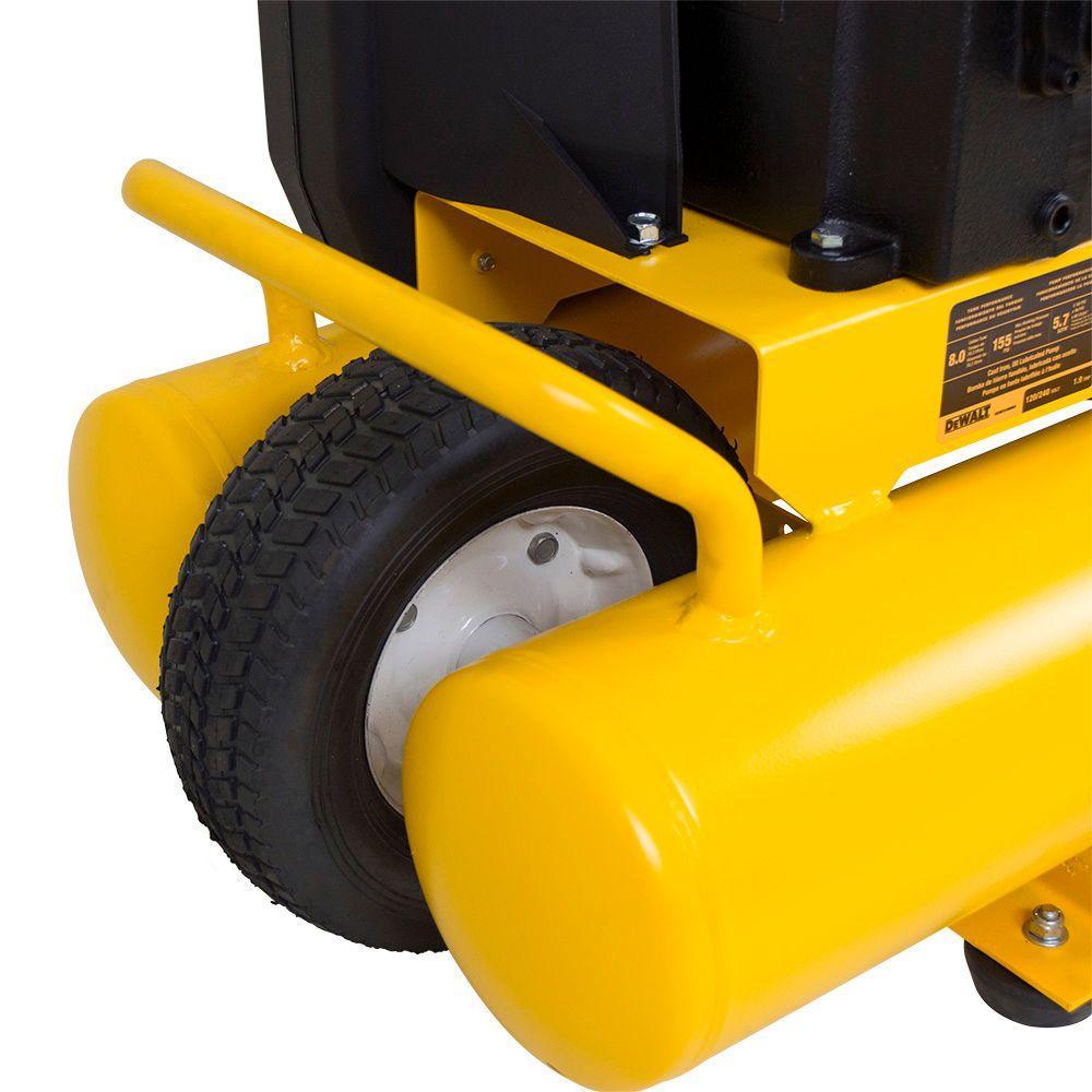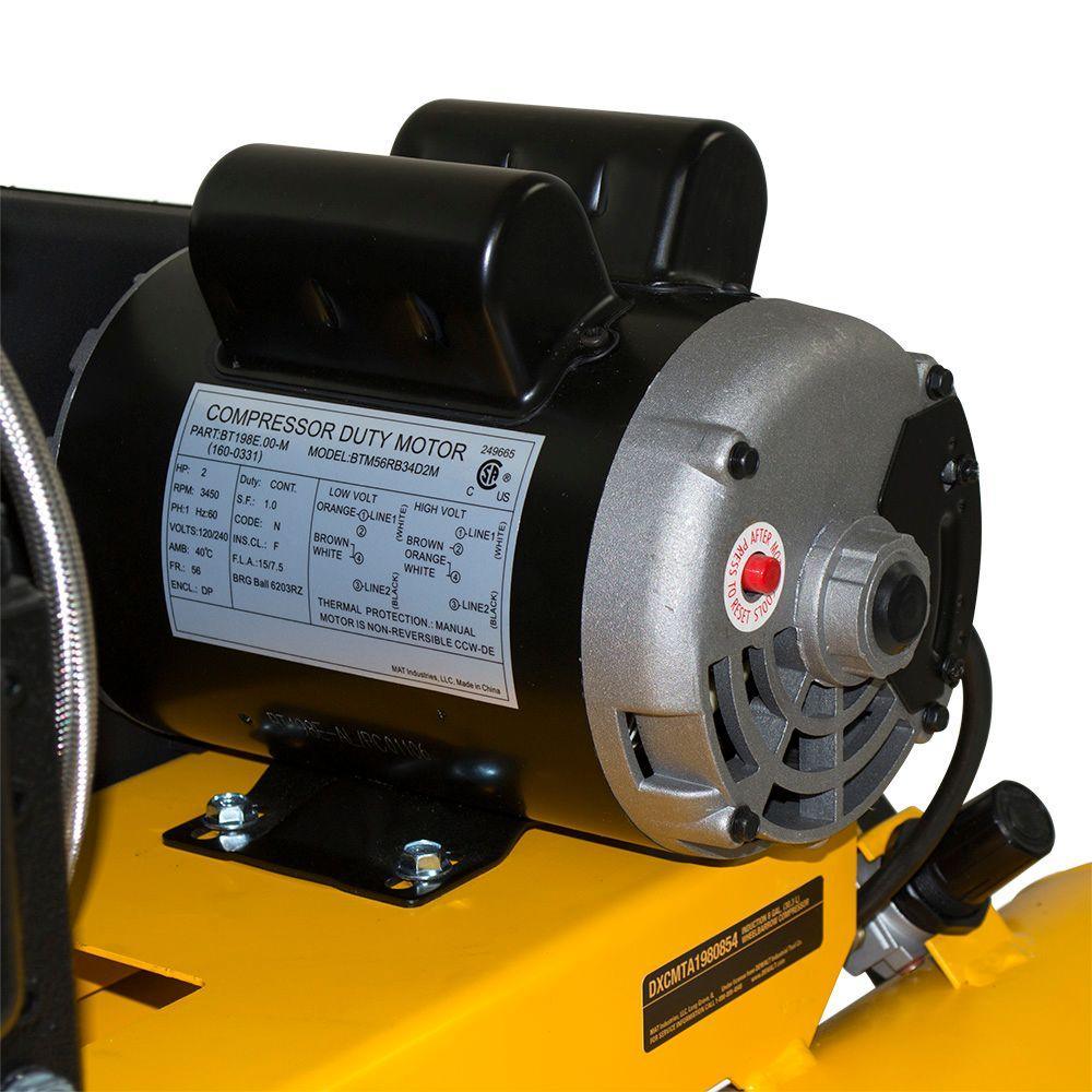 The DEWALT 8 Gallon Air Compressor has a powerful and reliable 1.9 HP heavy-duty induction motor, helping to ensure trouble-free operation with an easy start and the ability to drive high-pump performance. The cast iron, twin cylinder pump with a thermally stable cast iron twin cylinder body and valve plate delivers a surge of air power and recovery needed to run extra nailers. A fully enclosed metal belt guard covers and protects moving parts, while a ball drain valve allows for quick and thorough tank draining.