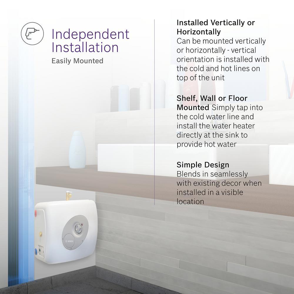 The Bosch 7 Gal. electric water heater has a 7 Gal. mini tank that fits under your sink to provide hot water right where you need it- at the point of use. The heater must be hardwired into your home's electrical system and has a lightweight, compact design. A glass-lined tank offers great insulation, while the heater's fast recovery rate eliminates long waits for hot water. A temperature-and-pressure relief valve enhances your safety.