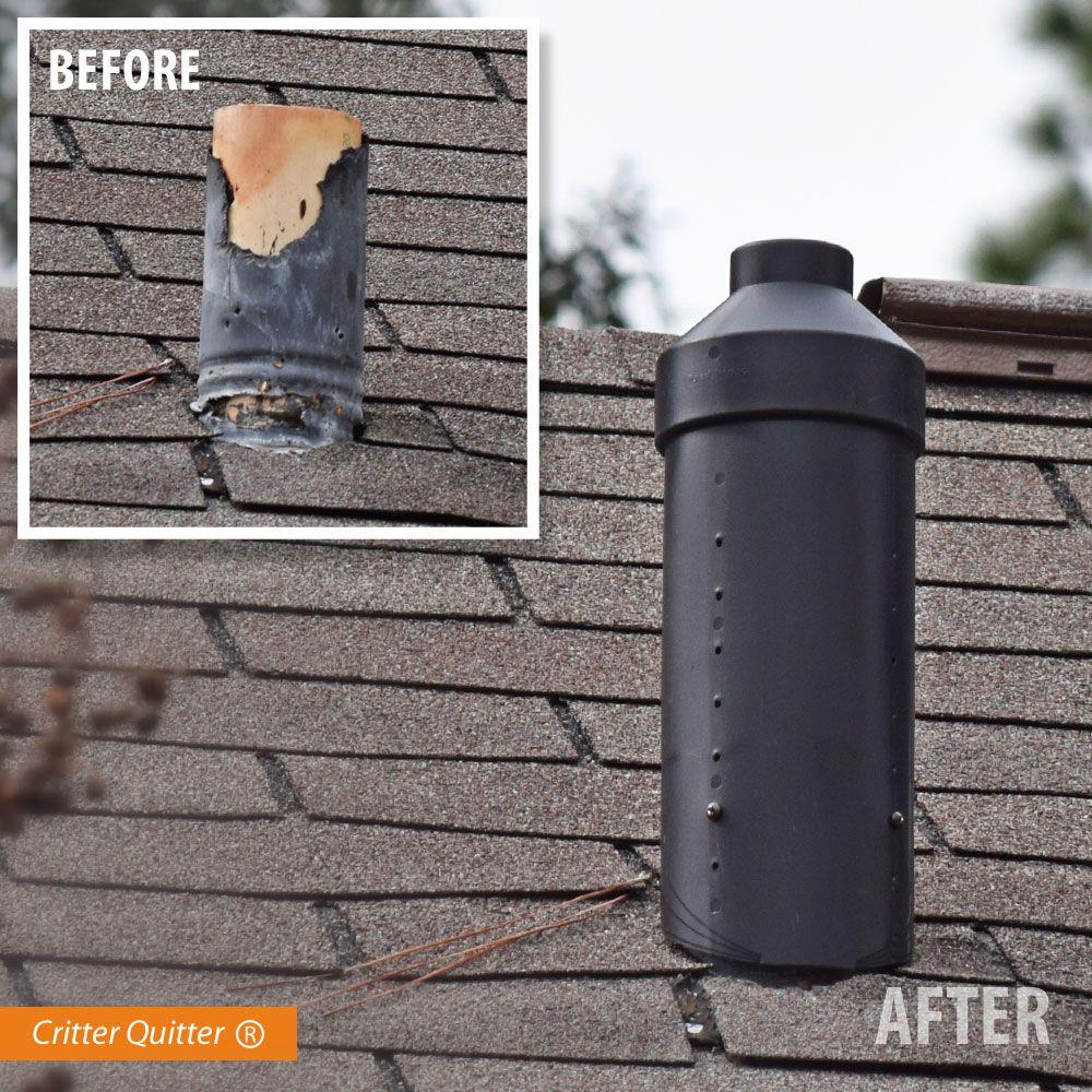 In many areas of the United States plumbing vents are sealed with lead. Unfortunately, squirrels like to gnaw on the lead and tear it open, potentially causing roof leaks. Over time, these leaks can cause significant damage. In addition plumbing vents are a major entry point for frogs, rats and other animals to enter into toilets. In the past the only way to repair this was to call a contractor, have them pull shingles, replace the lead and put a screen on the repaired vent. A repair that requires shingle removal rarely looks good potentially exposes damage and is expensive. Critter Quitter offers a cost effective and attractive solution to this problem. A home owner can repair their damaged plumbing vents without having to remove shingles or call a professional. Simply cut the unit to match your roof pitch, slide the unit onto the damaged vent and secure with 4 stainless steel screws (provided). The internal component will direct rain water into the vent keeping the damaged portion dry and keep animals out of plumbing. The unit is easily removed if plumbing vent access is required.