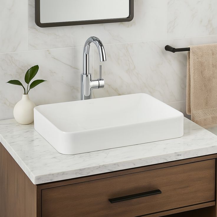 The KOHLER Vox Rectangle Vessel Sink combines sleek design with durable vitreous china construction, making it a striking focal point for any modern bathroom. Its above-counter installation and overflow drain ensure functionality and style.