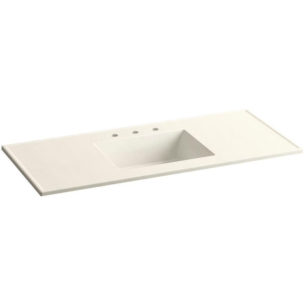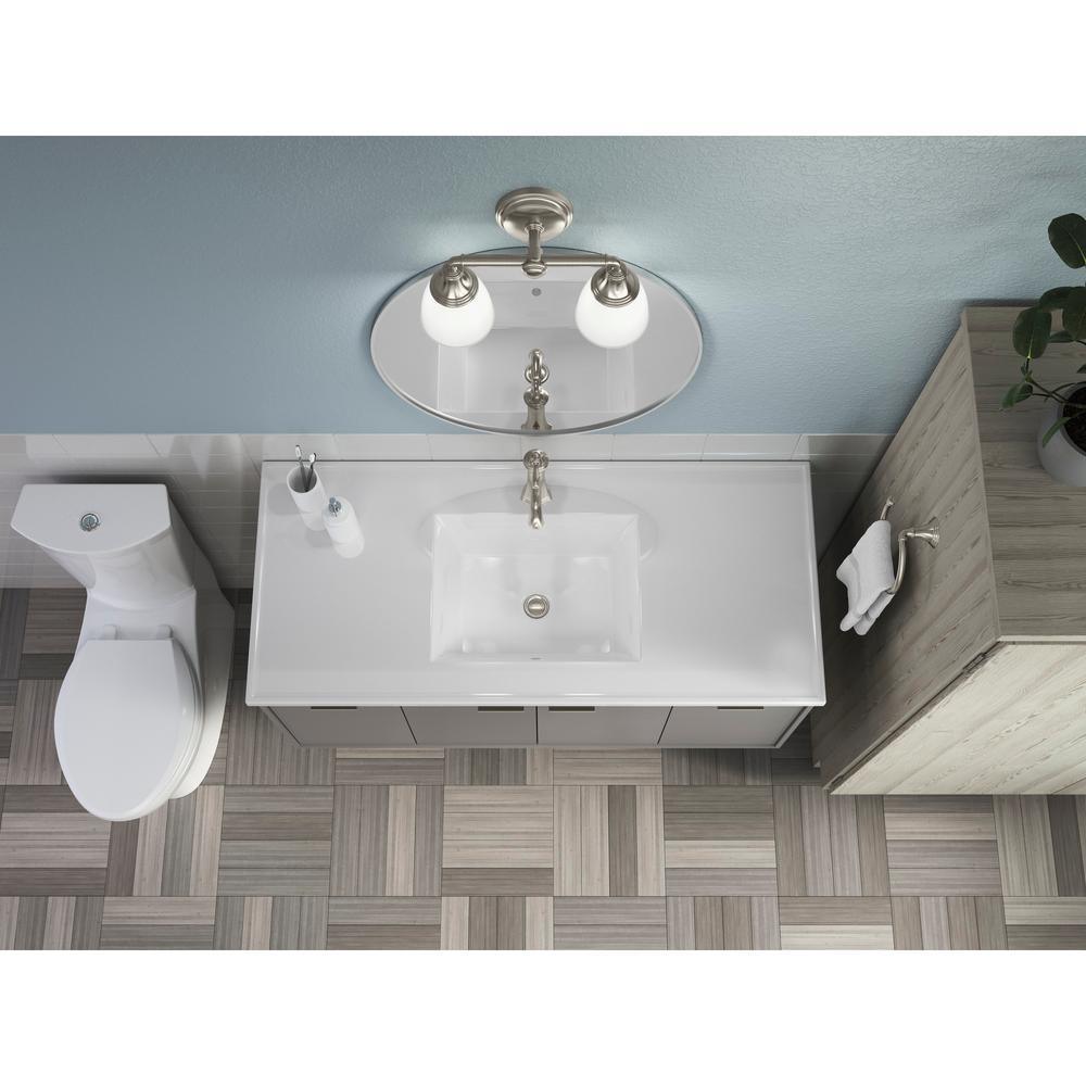 This 49 in. integrated vanity top and sink from KOHLER offers a beautifully coordinated and easy design solution to reflect your unique bathroom style. With one-piece, seamless construction to simplify cleaning, Ceramic/Impressions vanity-top sinks feature a raised edge to keep water contained and prevent toiletries from rolling off the side. This unit is fashioned with a predrilled hole to accommodate your favorite single-hole faucet (sold separately) while the White Impressions finish evokes a rich, spa-like feeling that will redefine your powder room aesthetic. It pairs perfectly with a 48 in. vanity cabinet from the KOHLER Tailored collection, and the dimensional finish is color-matched to existing KOHLER vitreous colors.