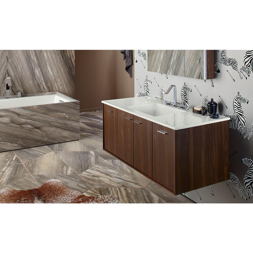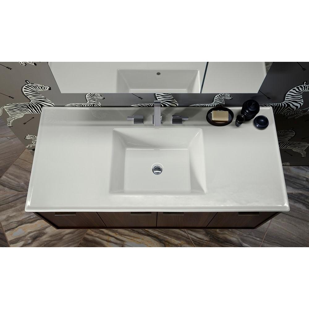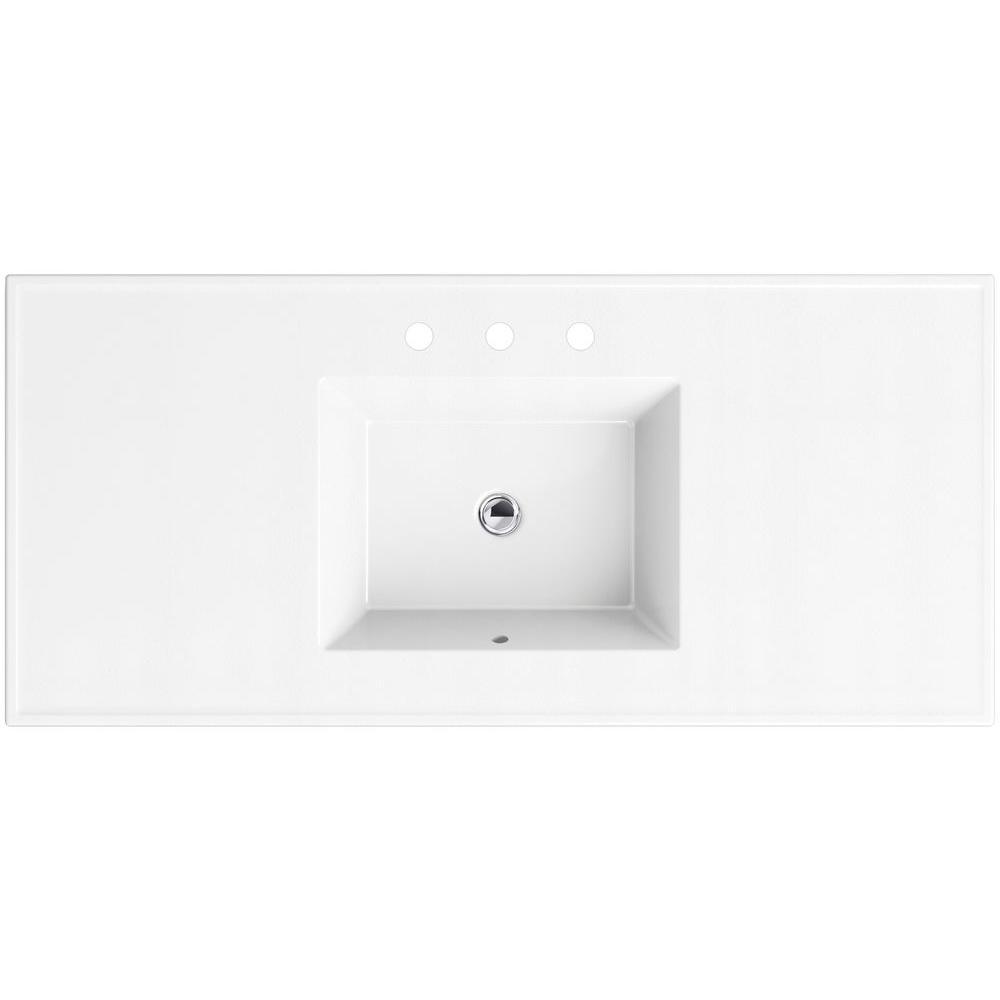 This 49 in. integrated vanity top and sink from KOHLER offers a beautifully coordinated and easy design solution to reflect your unique bathroom style. With one-piece, seamless construction to simplify cleaning, Ceramic/Impressions vanity-top sinks feature a raised edge to keep water contained and prevent toiletries from rolling off the side. This unit is fashioned with three predrilled holes to accommodate your favorite 8 in. widespread faucet (sold separately) while the White Impressions finish evokes a rich, spa-like feeling that will redefine your powder room aesthetic. It pairs perfectly with a 48 in. vanity cabinet from the KOHLER Tailored collection, and the dimensional finish is color-matched to existing KOHLER vitreous colors.