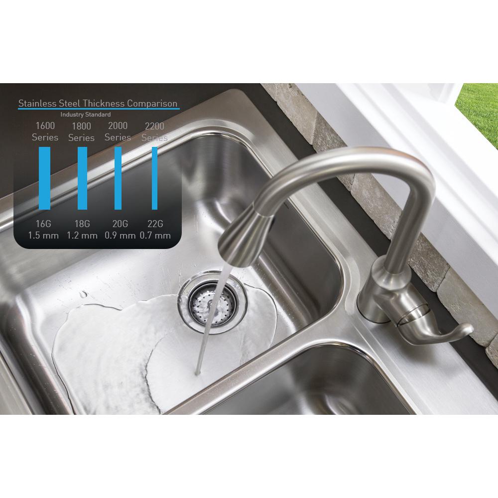 High quality construction and extensive selection come together in our 1800 Series. Strong 18-Gauge stainless steel serves as a solid base for a wide array of design options. Exceptional sound deadening and a wear-resistant uniform brushed finish.