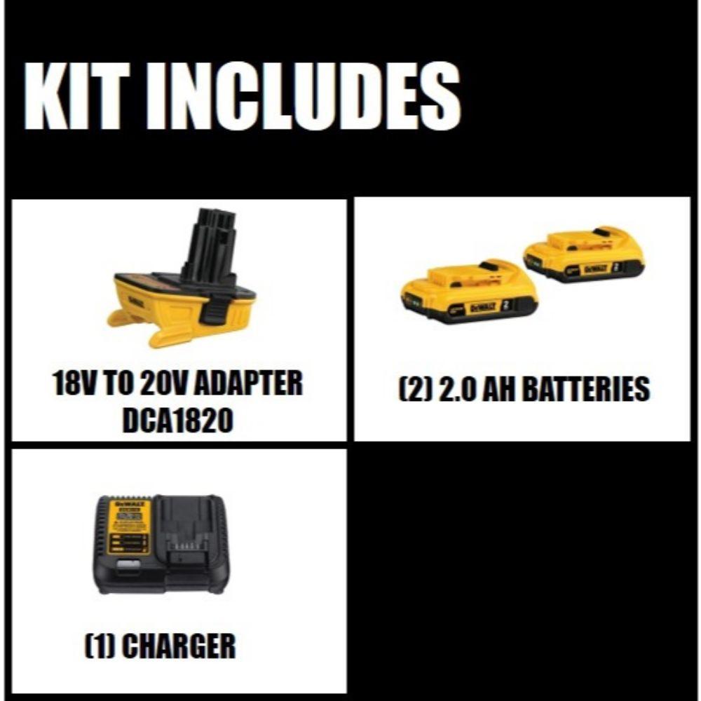 Add versatility to your toolbox with the DEWALT DCA2203C 20-Volt MAX to 18-Volt battery adapter kit. This adapter allows you to use selected DEWALT 20-Volt MAX lithium-ion slide pack batteries with DEWALT 18-Volt power tools. Now you don't have to compromise when it comes to battery packs or buy duplicate tools.