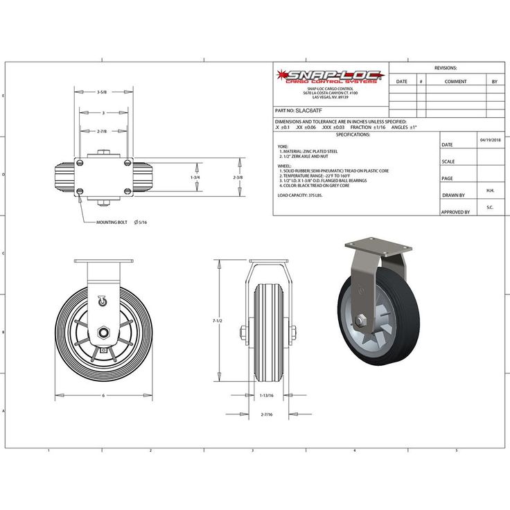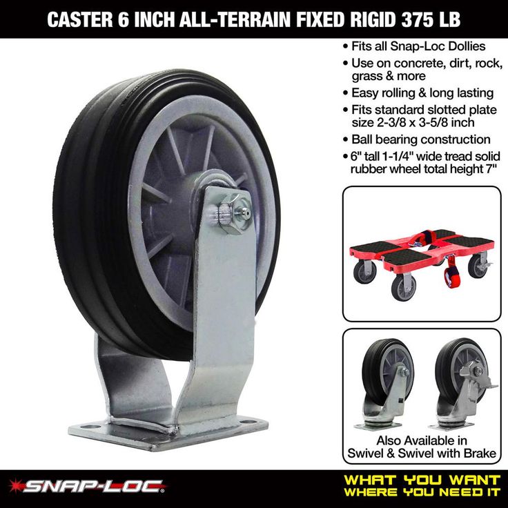 Easy rolling Air Filled 375 lb. capacity 6 in. Fixed caster with standard size 2-3/8 in. x 3-5/8 in. slotted plate. Includes ball bearing construction, pneumatic rubber tires and 1-3/4 in. W tread with an overall caster height of 7-1/2 in. They are the perfect replacement caster for any standard wood dolly and also the SNAP-LOC Dolly.
