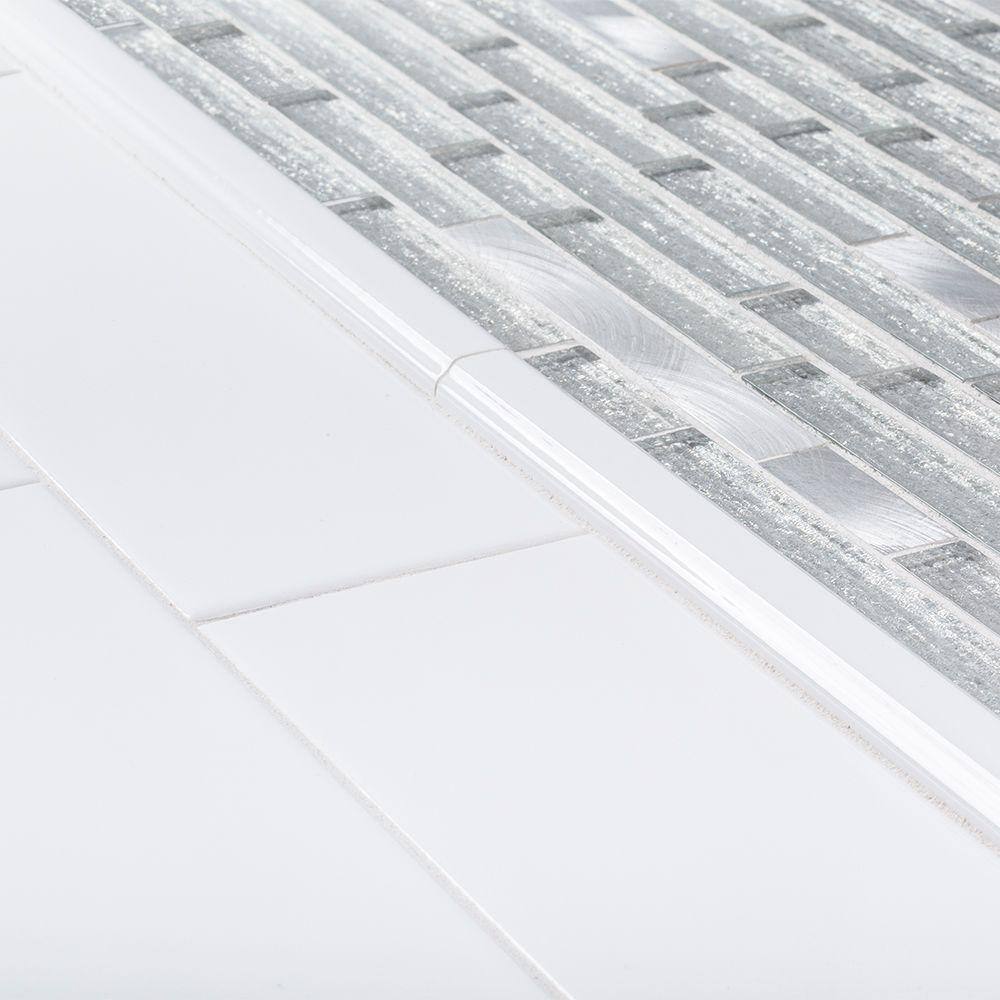 This Jeffrey Court Ice Pencil mosaic blends textured glossy glass with brushed stainless steel for a sleek, dimensional look. The interlocking linear pattern arrives mesh-mounted for easy wall installation, ideal for backsplashes and bathroom accents.