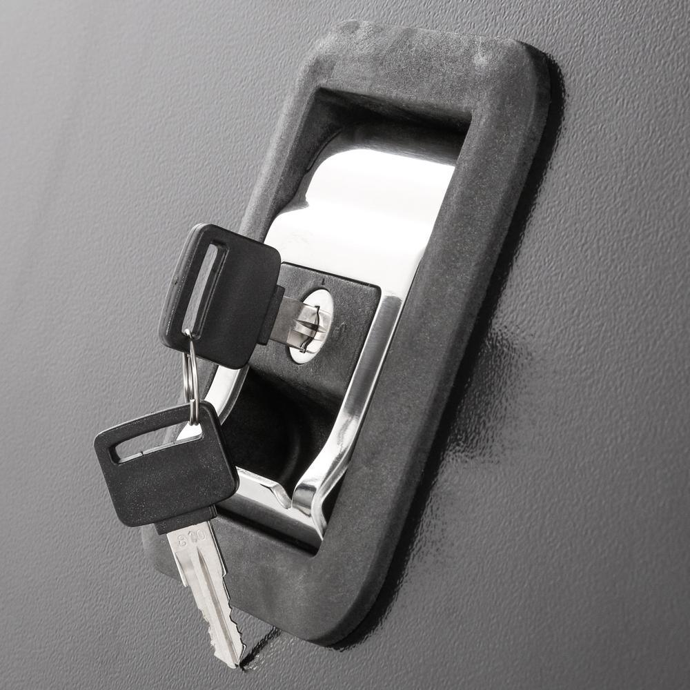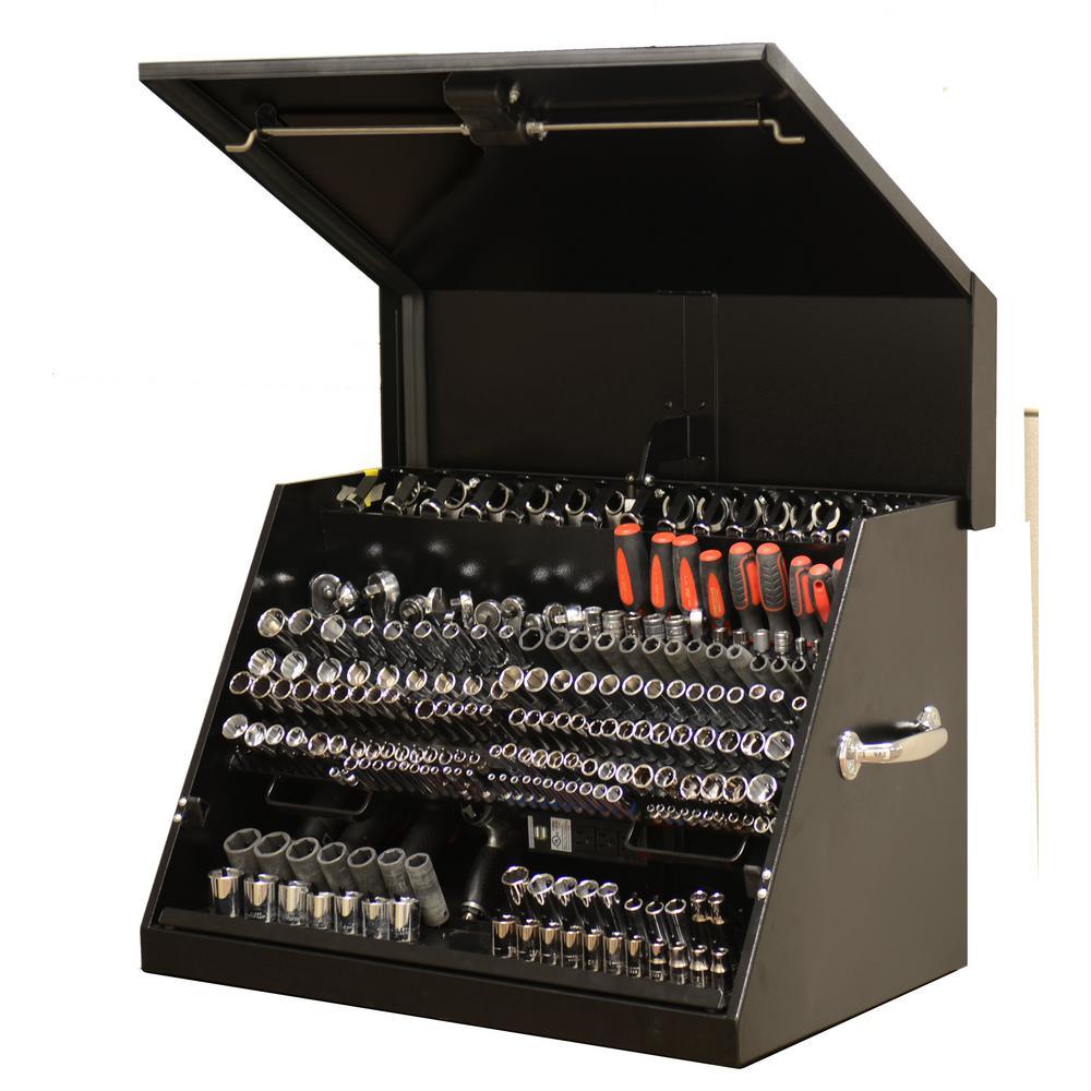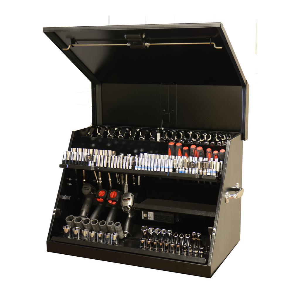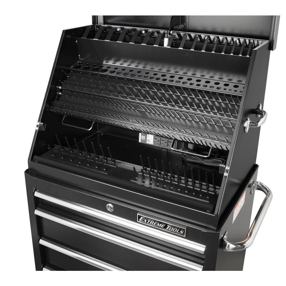 The Extreme Tools PWS 30 in. Portable Workstation in Black is an effective tool storage unit. Great for heavy use, this Extreme Tools portable workstation is built with a 15-gauge steel construction with welded seams to offer you a reliable and sturdy finish. This tool storage system has a high-gloss powder coating that features scratch and weather-resistant properties, which strengthen the unit and provide increased protection from normal wear and tear experienced in a workshop. It is designed with a lid that features gas struts, ensuring smooth opening and closing of the chest. It features a shelf and two trays, allowing for complete customization of your tool organization system. This Extreme Tools portable workstation is built with a keyed lock to secure your tools and equipment after use. Including two heavy-duty handles, it enables you to easily maneuver it around the workshop. The Extreme Tools PWS 30 in. Portable Workstation in Black is the ideal pick for workshop and garage storage.