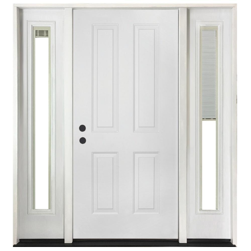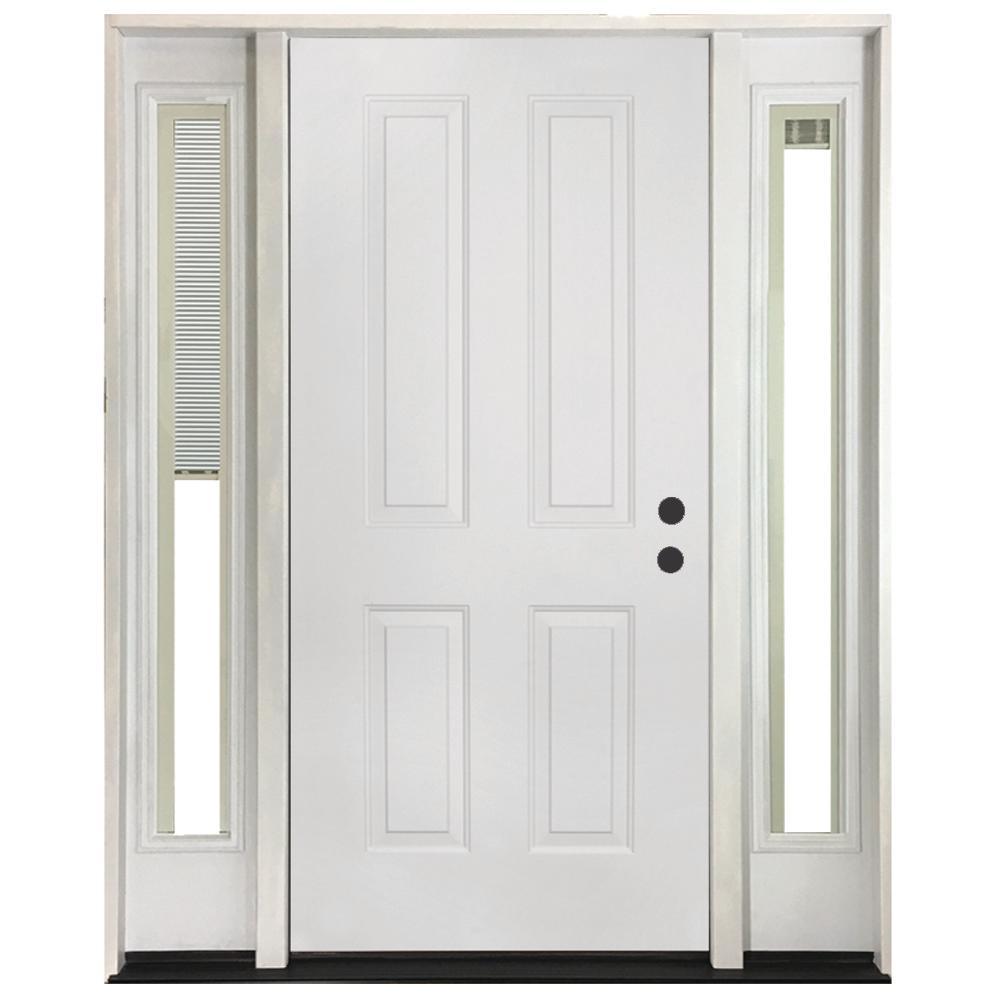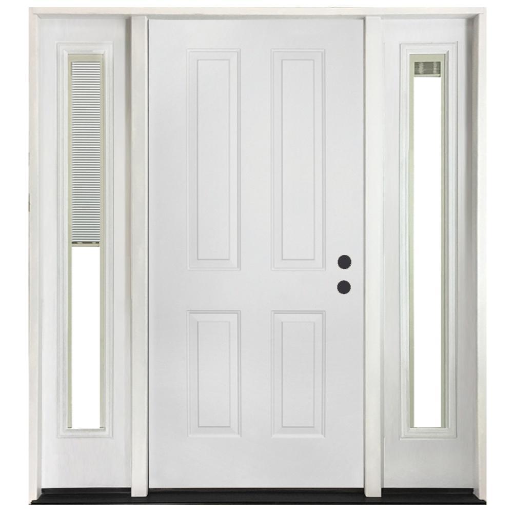 The Steves & Sons Premium 4-Panel with high-definition design and full lite sidelites with mini blind provides lasting beauty and security. This dashing door is sure to capture attention and add value to any home. This Energy Star qualified 1-3/4 in. door is bored for lockset and deadbolt and ready to install in existing opening. The Door is primed and ready to finish in a color of your choice that best compliments your household.