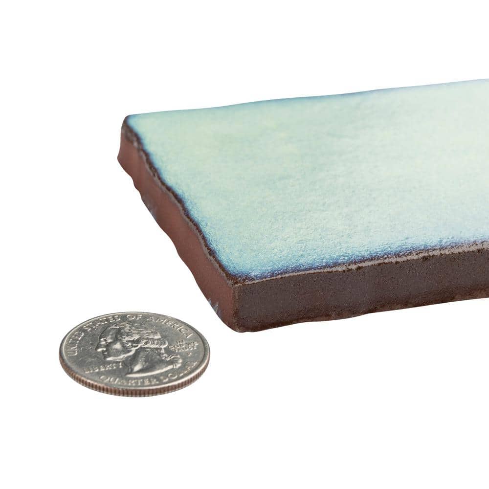 Q: What is the tile’s finish and thickness? A: Glossy, smooth finish; approximately 10 mm (0.38 in.) thick.