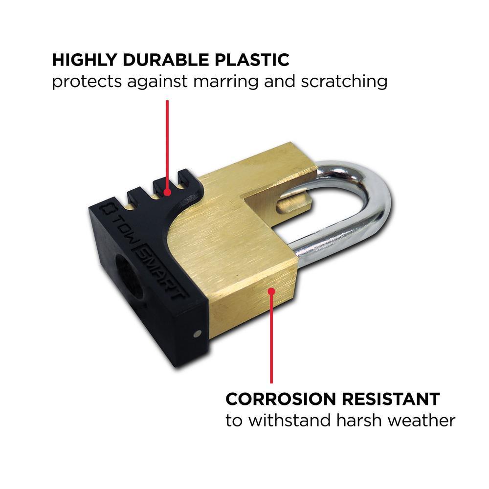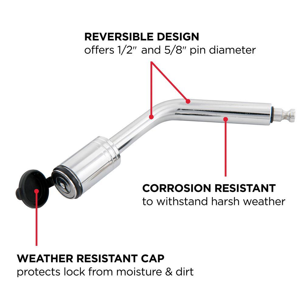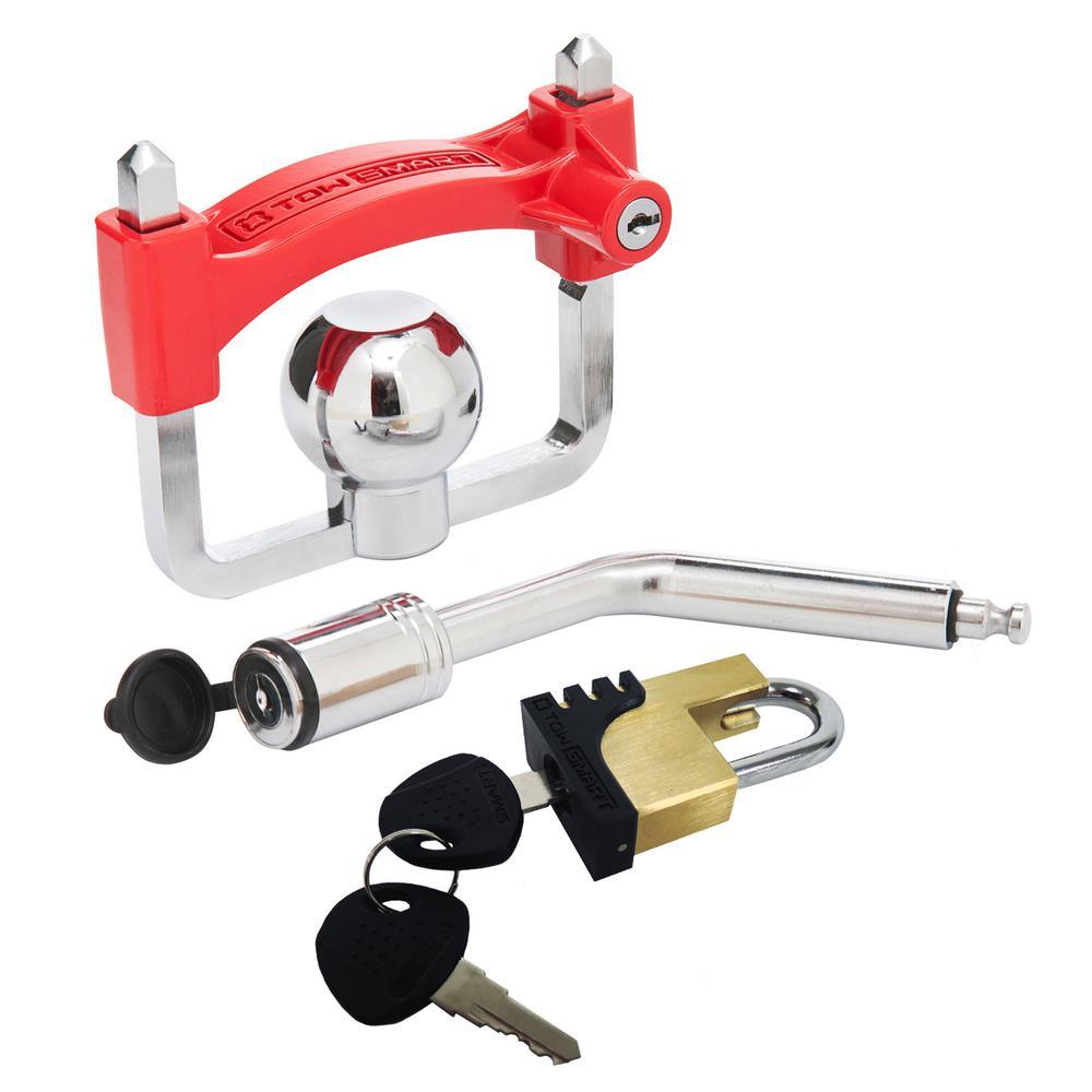 The TowSmart Boomerang Hitch Pin and Coupler Lock protects your boats, campers, trailers, equipment and other valuable assets from theft. It easily secures your ball mount or hitch accessories to the receiver hitch. Simply insert the pin into the fastener hole once you have positioned the ball mount or hitch accessory in the receiver hitch. The Boomerang Hitch Pin offers a patented, reversible dual diameter design that fits 1/2 in. and 5/8 in. receivers. It provides a tight and secure fit and is made of corrosion-resistant materials designed to withstand harsh weather conditions. The Coupler Lock secures the trailer to the ball mount when in tow and provides superior protection to the trailer when it is left unattended. Weather resistant dust caps protect the locking mechanism from moisture and dirt build up. This product is not recommended to remain on vehicles for an extended period of time. Includes 4 keys that are keyed alike for convenience rather than having multiple keys.