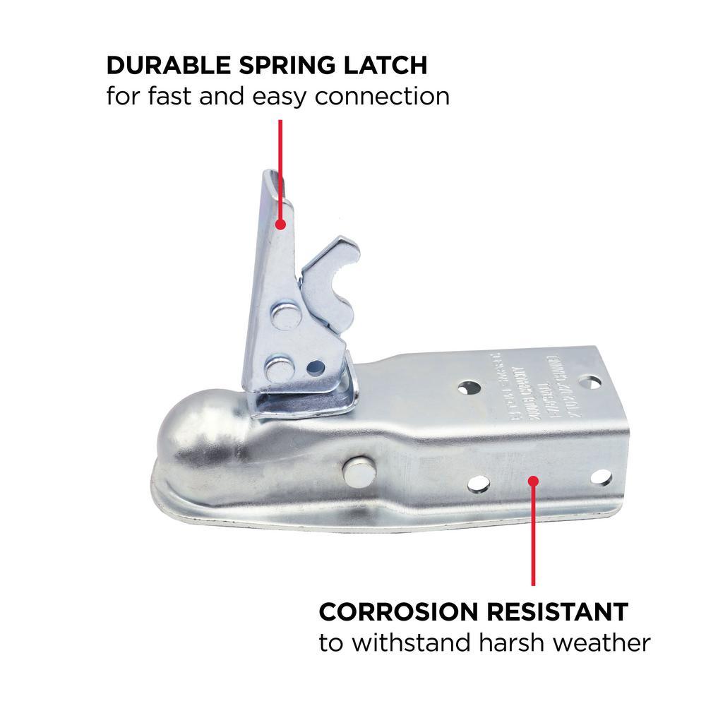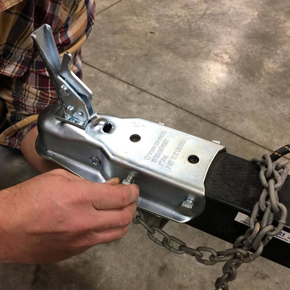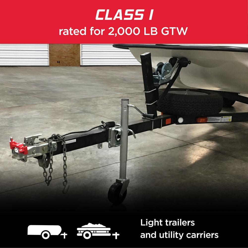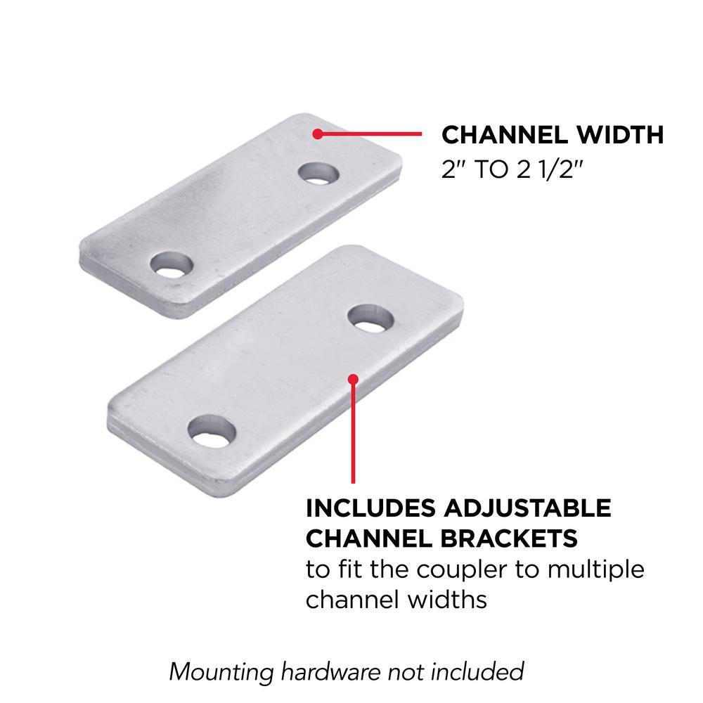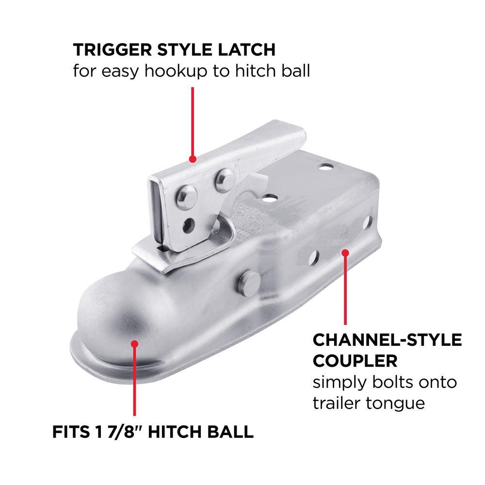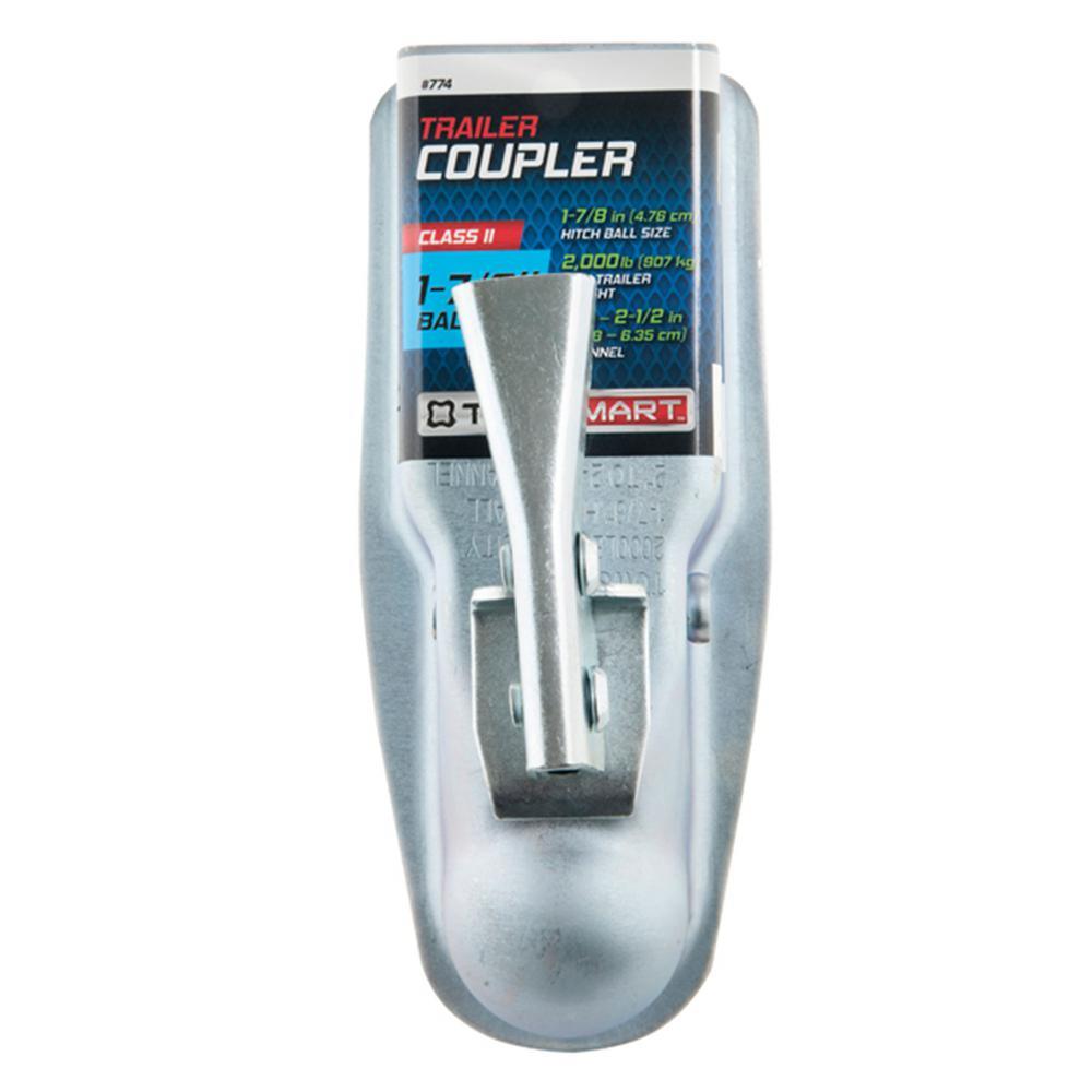 The TowSmart Class I Coupler fits a 1-7/8 in. hitch ball and has adjustable collars to fit a 2 in. or 2-1/2 in. channel width. The coupler is zinc-plated to resist corrosion and rust. 2,000 lb. MAX Trailer Weight.