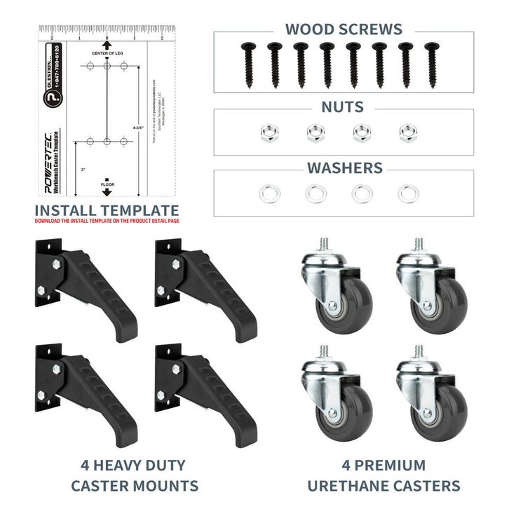 The POWERTEC Workbench Caster 4-Piece Set is the perfect solution for easily positioning your heavy workbench to any desired area in your shop. Simply push down on the foot pedals to elevate your workbench off the floor 3/4 in., move to preferred location, then lift up foot pedal to lower table firmly back onto the floor. Each 2-3/8 in. urethane caster can support 100 lb.; 400 lb. combined capacity. Experience ease of movement with caster's 360-degree pivoting action. All mounting hardware is included.