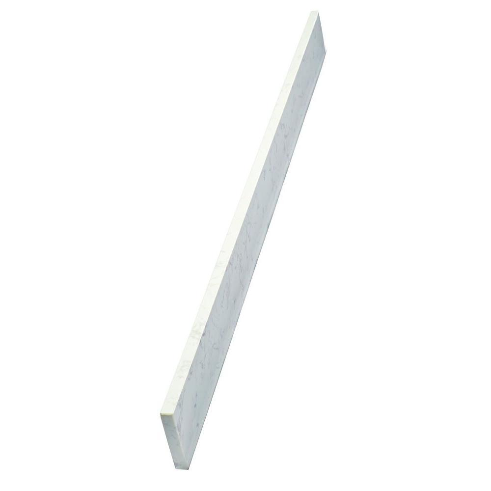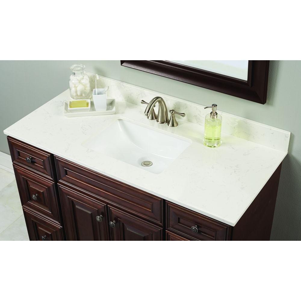 Enhance your decor with the Vanilla Sky Engineered Marble vanity top and the attached under-mount vitreous-china sink. A perfect solution for a quick and easy remodel, this lovely classic pale, dove-grey on milky white veined pattern creates a distinct pattern. With a polished finish and medium variations, this is an ideal product for various installs. Note: Digital photographs are not fully representative of the final product and do not exhibit all the characteristics of a design. Variations in color, pattern, size, shape and shade are inherent and unique characteristics of an engineered marble and it is to be expected with this product. Performance of the material is not affected by these variations and do not qualify for product replacement. All stone can be damaged by force and no stone is chip proof. Objects hitting edges particularly at sinks may cause chips. Surfaces can be damaged by sudden and/or rapid change of temperature, especially near the edges, as well as direct and/or sustained heating of top.