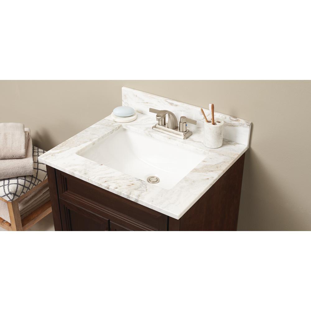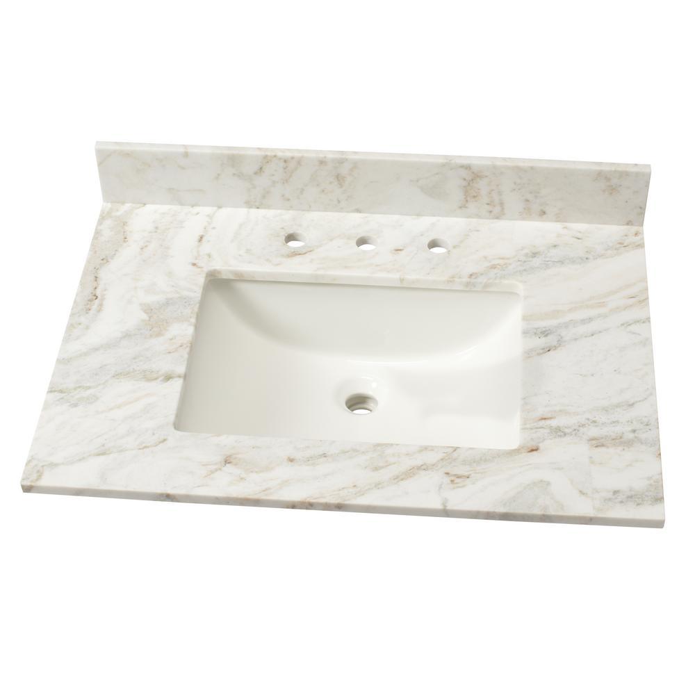 Add a luxurious touch to your space with Arabescato Venato Marble vanity top and attached under-mount vitreous-china sink. A lovely blend of clean whites and distinctive veining, Arabescato Venato Marble brings sophisticated style to the room. Ideal for various installs, this vanity top is the perfect solution for quick and easy remodels. Note: Digital photographs are not fully representative of the final product and do not exhibit all the characteristics of a design. Variations in color, pattern, size, shape and shade are inherent and unique characteristics of an engineered marble and it is to be expected with this product. Performance of the material is not affected by these variations and do not qualify for product replacement. All stone can be damaged by force and no stone is chip proof. Objects hitting edges particularly at sinks may cause chips. Surfaces can be damaged by sudden and/or rapid change of temperature, especially near the edges, as well as direct and/or sustained heating of top.