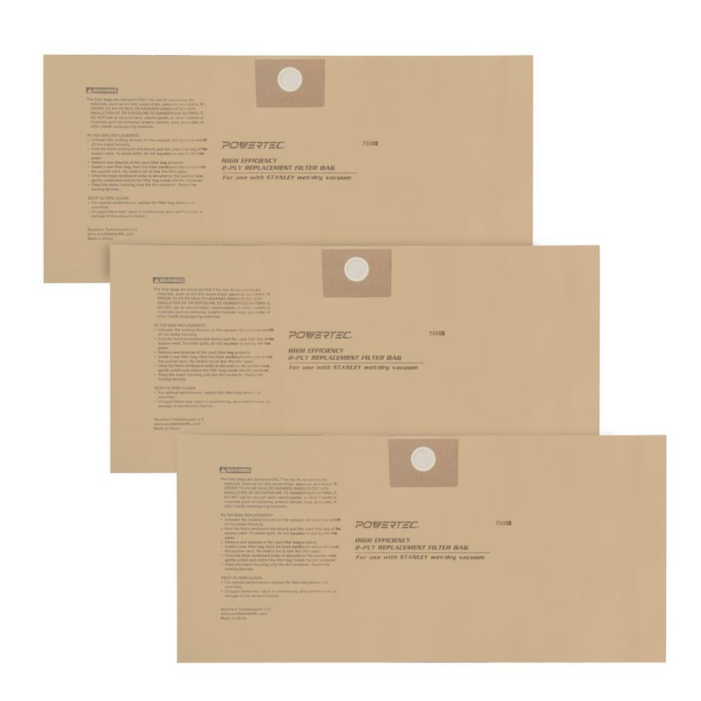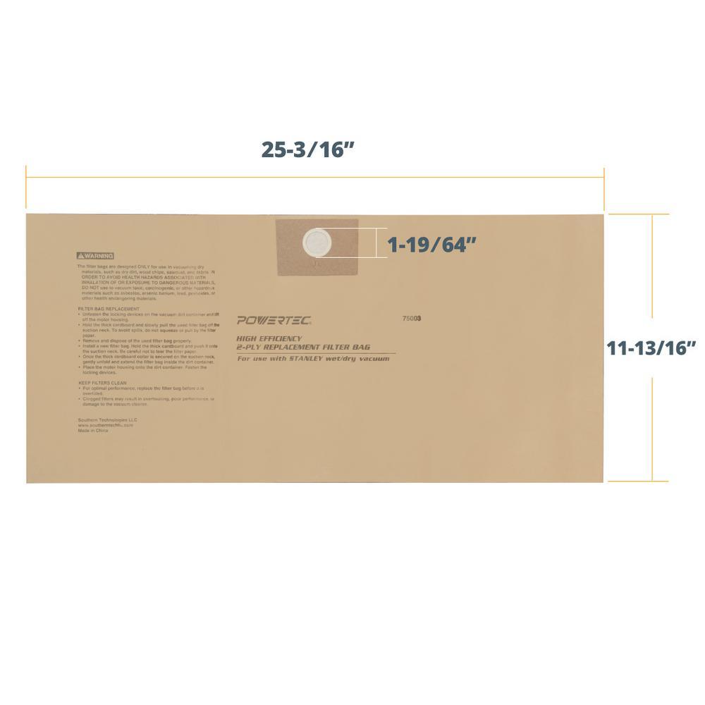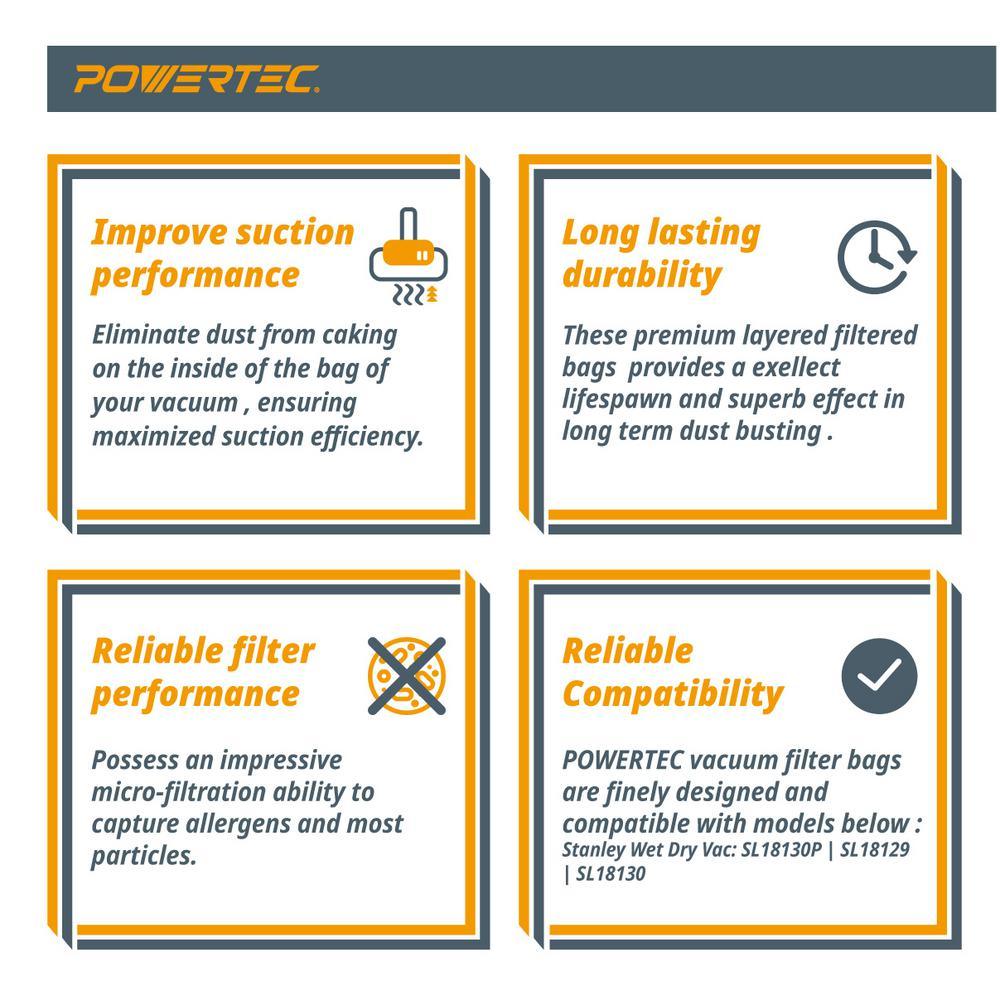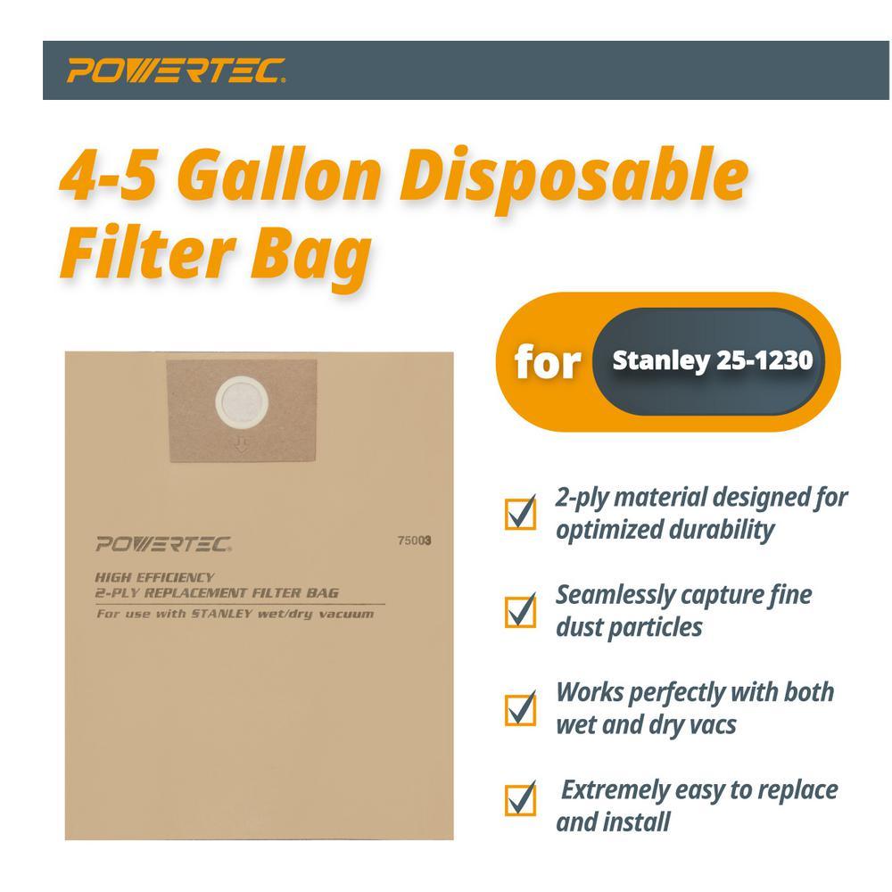 Introducing the Stanley shop vac bags (25-1230) by POWERTEC. These high efficiency vacuum filters present a premium and reliable alternative for your Stanley vacuum cleaners. Perfectly suited to collect an assortment of dry dust and debris, these filter bags are heavy duty and work flawlessly in accommodating 4-5 Gal. models. They feature a unique design that eliminates clogging or blockage, preventing your vacuum from overfilling. Not only are they easy to install, but when your vacuum is full, you’ll find these bags conveniently simple to replace. Made from a premium 2 ply material, they are 100% disposable, allowing you to toss and discard for a fast and easy clean-up. In the garage, at a worksite or on the go – You’ll find these perfect for handling all types of tough jobs and big messes – including the pickup of sawdust, drywall dust, or cement dust. These cost effective Stanley shop vac filters serve as premium OEM replacements, and are compatible with model numbers: SL18130P, SL18129, SL18130.