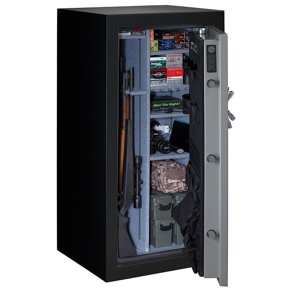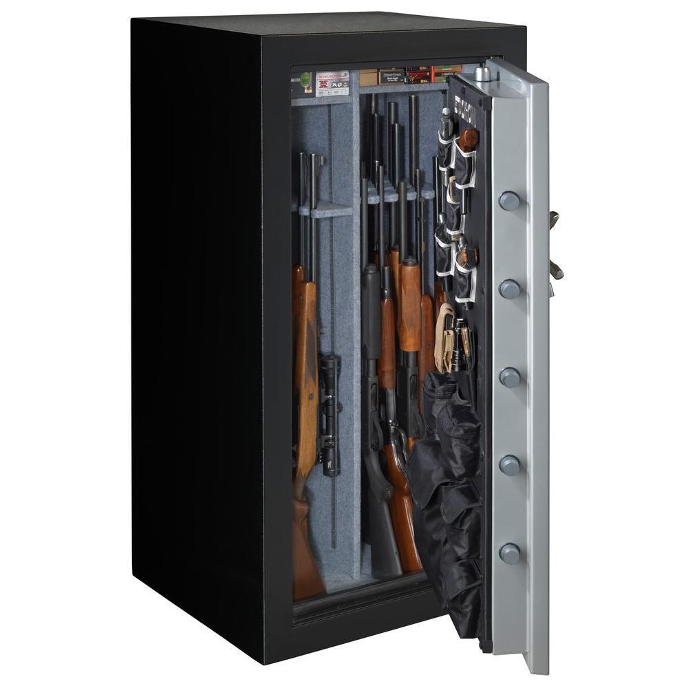 This 40-Gun Total Defense Safe is Fire Resistant for up to 75 minutes at 1,400 degrees F. Waterproof in up to 2 ft. of standing water for 72 hours. Equipped with a 4-way locking system with 1.5 in. tapered live action locking bolts for added security.