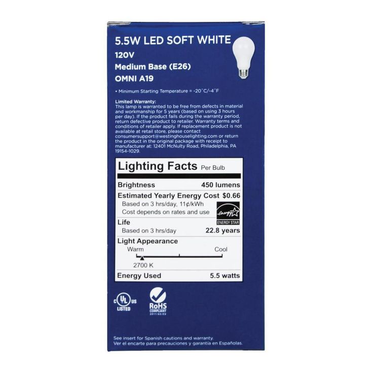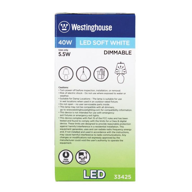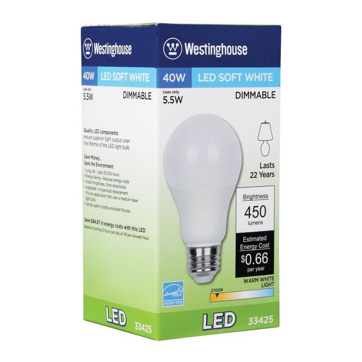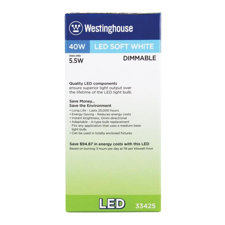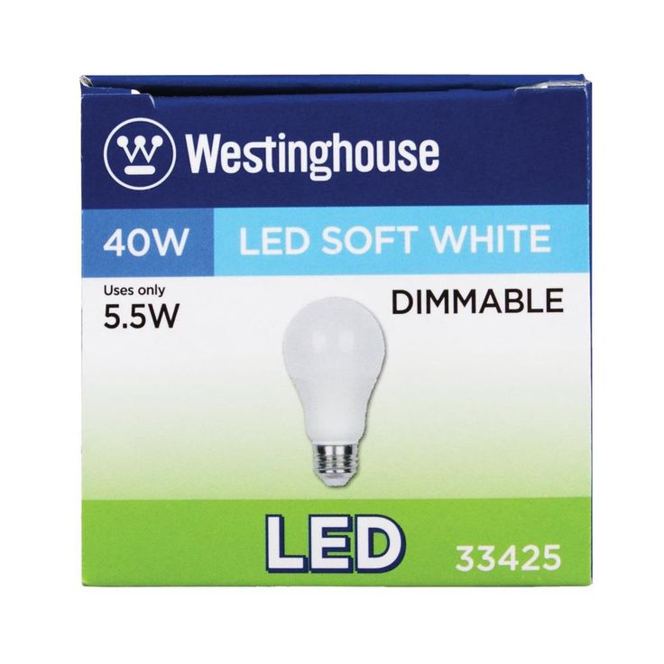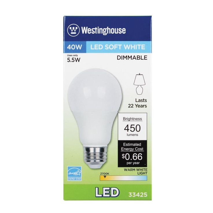 The Westinghouse 5-1/2-Watt (40W) A19 Dimmable LED Light Bulb with soft white color temperature is ideal for everyday use. This bulb can reduce energy and operating costs up to 86% compared to a standard incandescent bulb with the same brightness. This LED lasts over 22 years versus a 40-Watt incandescent bulb which only lasts 1 year. This LED saves about $94 in energy costs over the lifetime of the bulb compared to an incandescent bulb. This medium-base light bulb turns on instantly, is fully dimmable and is compatible with most dimmers. This light bulb produces a soft white light and is ideal for overall, task and accent lighting. Perfect for use in pendant fixtures, table and floor lamps, vanity fixtures, ceiling fixtures and ceiling fans and is suitable for use in damp locations such as outdoor wall, ceiling and post lanterns. Free of harmful mercury, this LED is an environmentally-friendly choice. Westinghouse is a trusted, global brand. Westinghouse knows lighting and offers products with exceptional quality, reliability and functionality. Based on burning 3 hours per day at 11¢ per kilowatt hour for 22 years or 25,000 hours. Product reference number 33425.