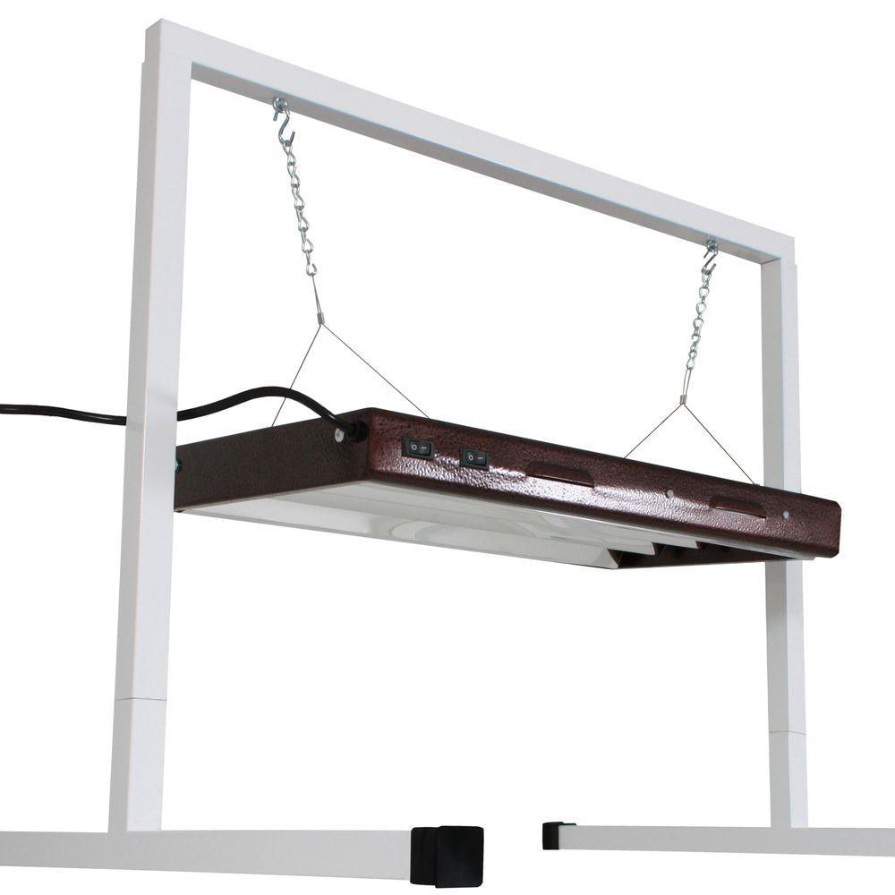 The ViaVolt T5 HO grow light kit with light stand is an energy efficient kit that comes with a state of the art advanced fluorescent grow light fixture that includes four, 2 ft. blue spectrum (6500K) bulbs -- 2,000 lumen output per bulb. The ViaVolt T5 grow light is ideal for growing plants, cuttings, seedlings, fruits and vegetables. This unit includes wire cables and hardware for hanging and adjusting. The highly reflective chrome insert assures the best growing results with a combination of even light dispersion and intense reflectivity. The Copper coated louvered steel housing assures cool operation and is durable for years of use. Each unit also has two on/off power switches allowing you to operate four bulbs per switch. The ViaVolt HO T5 fluorescent fixture runs on 120-Volt and is accompanied by a 12 ft. power cord. Each grow light has a daisy chain feature allowing multiple units to be connected to one another. The propagation light stand is made of durable steel that is white powder coated and rust resistant for use in humid greenhouse environments. If you would like to view other plant grow lights with light stand please view these product codes: VLS4S41, VLS2S21, VLS4S44, and VLS4S48.