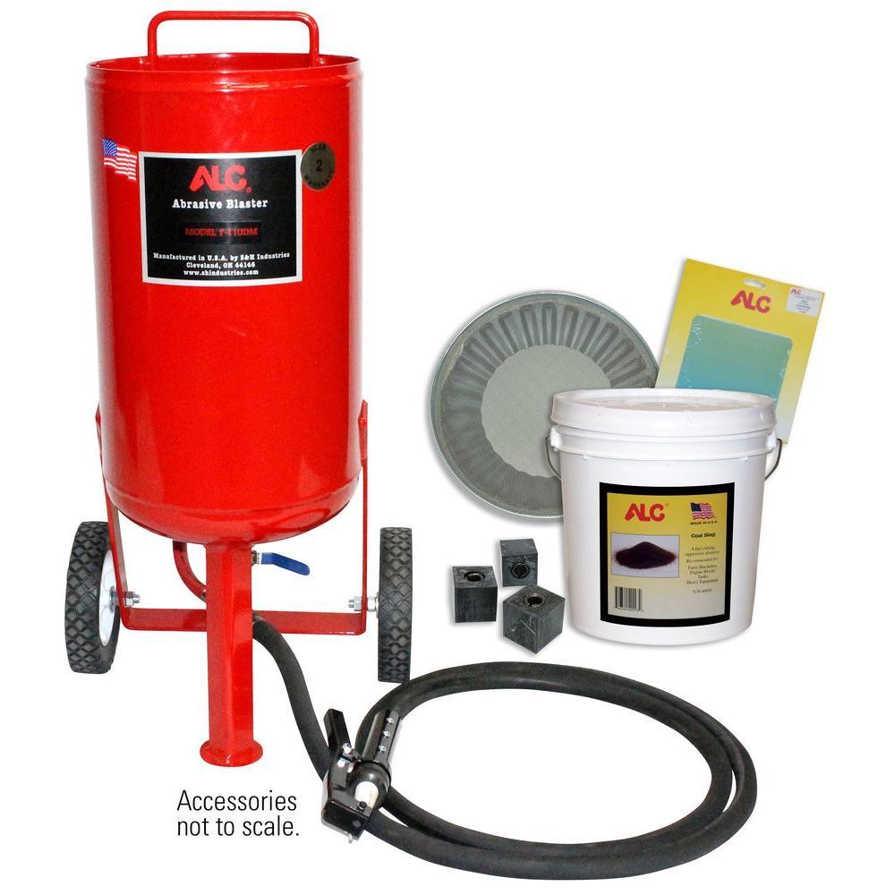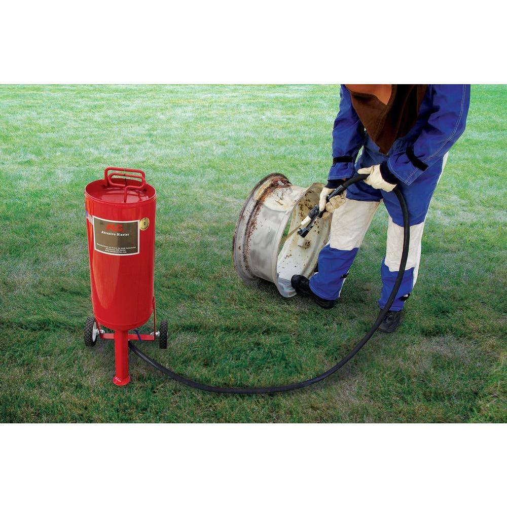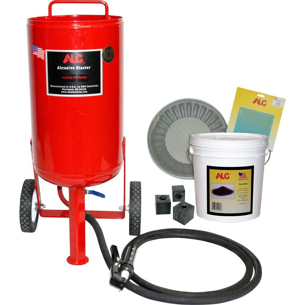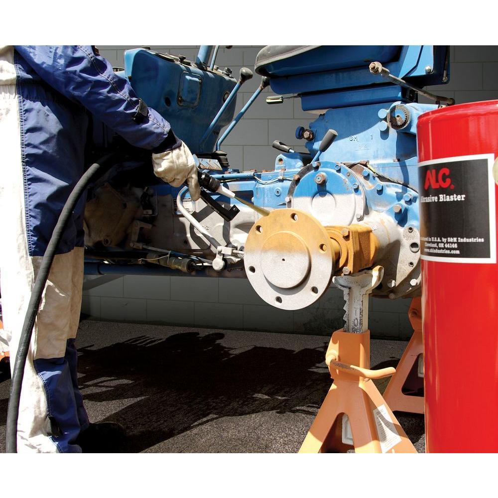 This ALC abrasive pressure blaster is prefect for a wide variety of surface preparation jobs such as removing paint, scale, rust and oxidation. Features a 10 ft. heavy duty Goodyear blast hose designed for long life and maneuverability. Durable wheels and built-in handle allows for easy transport. Heavy duty steel deadman shutoff handle for longevity and safety. Includes everything you need to start your blasting project today; 25 lbs. of coal slag abrasive, blast hood with bump cap and 5 in. x 6 in. lens, 5 extra 5 in. x 6 in. lens, abrasive strainer, 5 extra sealing blocks and (2) 1/8 in. and (1) 3/32 in. nozzle. Simply fill with abrasive and connect to an air compressor.