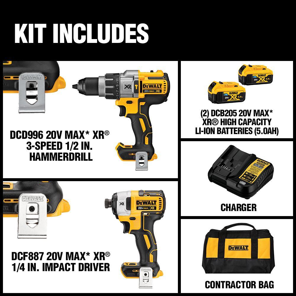 The DEWALT DCK299P2 2-Tool combo kit is ideal for most drilling and driving applications. This kit features a brushless hammer drill and impact driver. Both tools are designed to be compact for use in tight spaces.