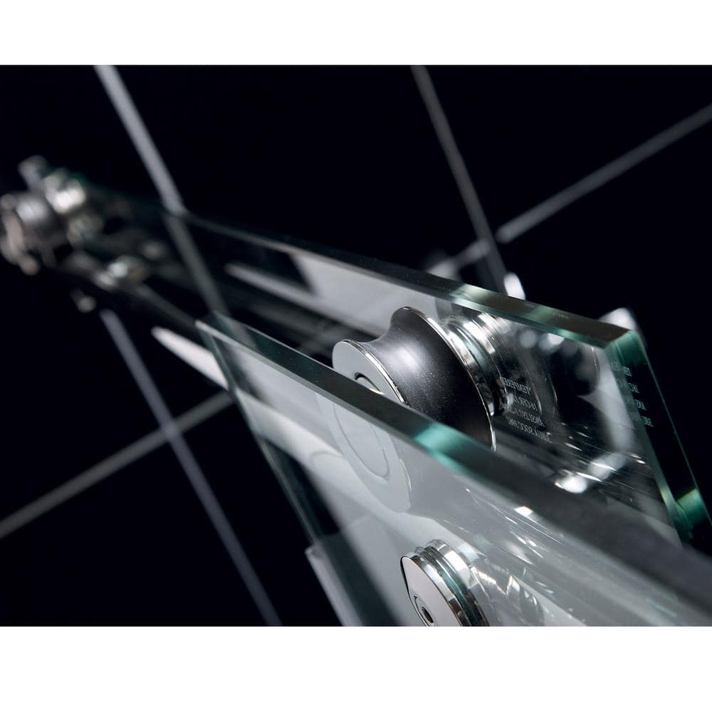 The DreamLine Enigma-X delivers a sleek, fully frameless sliding shower door with premium 3/8 in. clear tempered glass and brushed stainless steel hardware. Its ClearMax protective coating resists water stains for easier cleaning, while the top guide rail trims up to 4 in. for precise width adjustment.