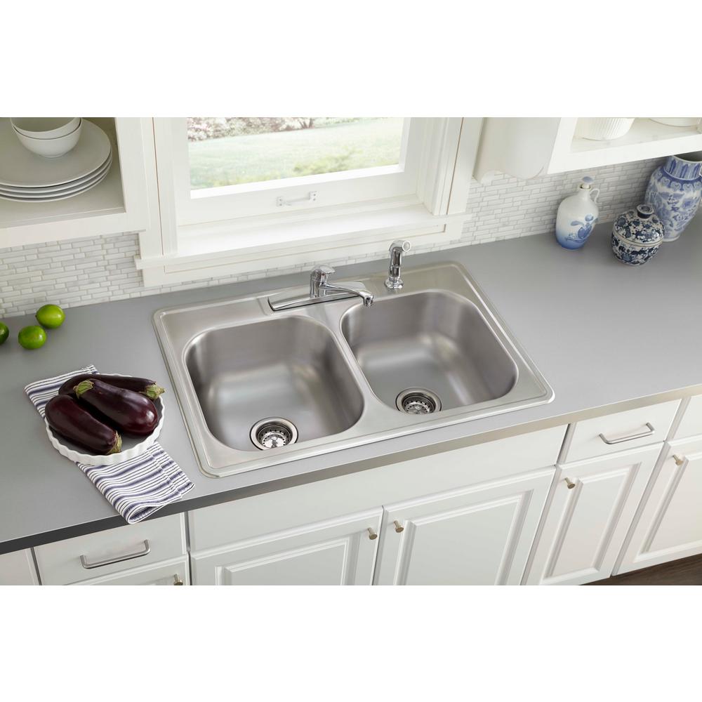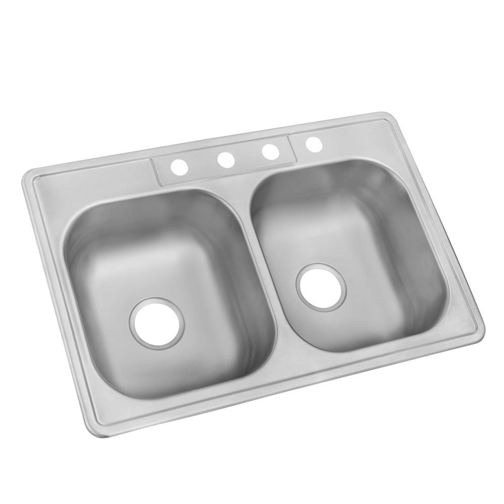 The Glacier Bay Top Mount 33 in. x 22 in. Double Bowl Kitchen Sink features 2 deep high-capacity sink bowls and is constructed from 20-Gauge stainless steel for durability. The sink also features a satin finish for added durability. The mass appeal design ensures that this sink works in a variety of kitchen styles.